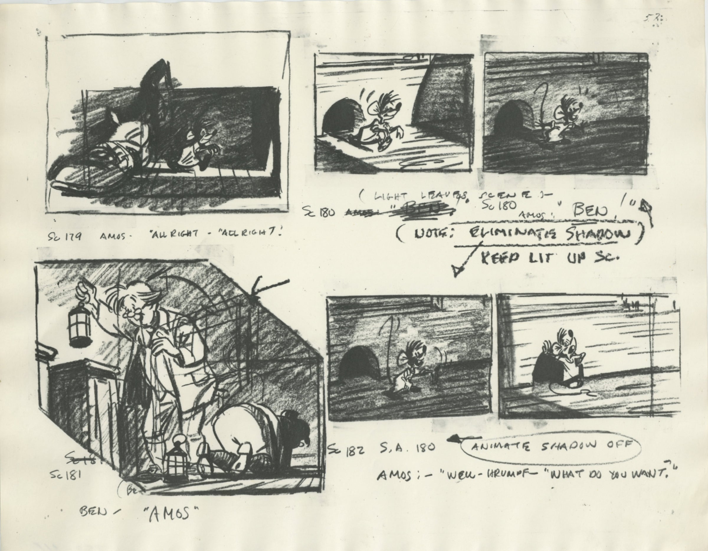 ABOUT THE MEDIUM: Storyboard Drawings show what’s moving in each shot, and in which direction, so that the production team is crystal clear on the desired end result. Photostat Storyboard Sheets are printed copies of the original storyboard drawings that were used by staff during the production of a film.