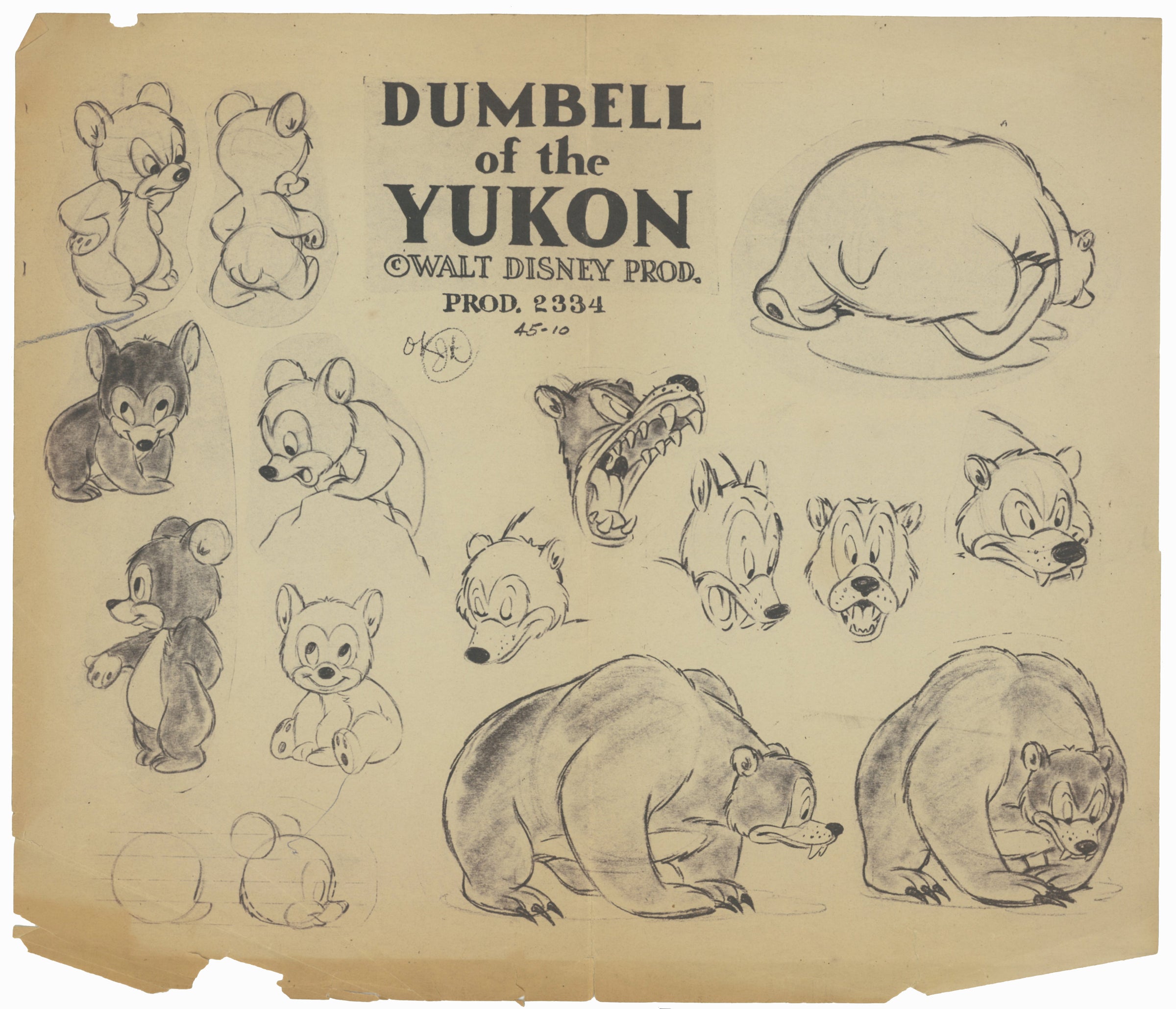 NOTES: This piece shows signs of moderate production wear: age-related toning, tears + wrinkles along margins. "OK JK," a note written by director Jack King, has been reproduced below the title of this model sheet.