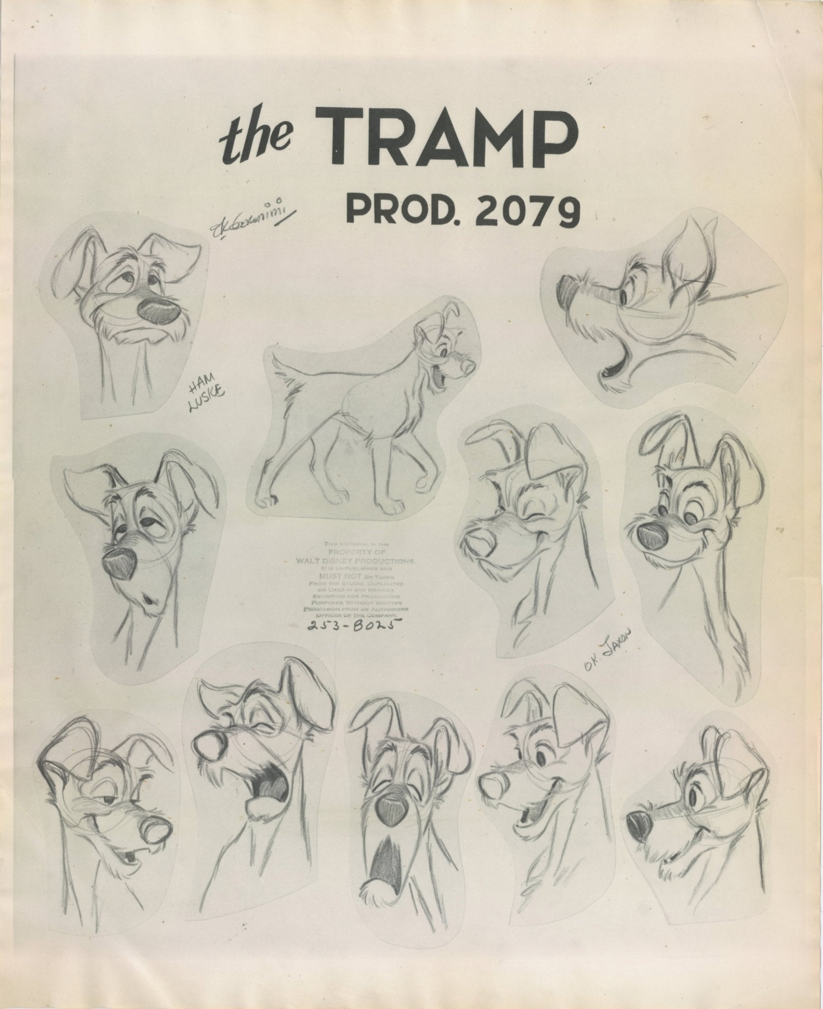 NOTES: "Geronimi," "HAM LUSKE," and "OK JAXON" (written by Clyde Geronimi, Hamilton Luske, and Wilfred Jackson respectively) have been reproduced on this model sheet. This piece shows signs of light production wear: corner crease, edge wrinkles, pin holes.