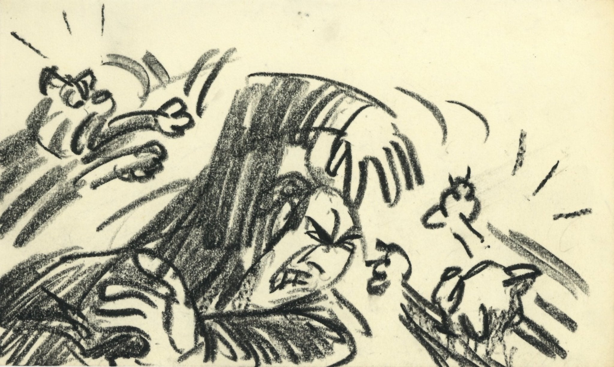 ABOUT THE IMAGE: This storyboard showcases the creativity involved in the making of The Aristocats. It was created for climactic sequence starting at about 1:12:52 when Edgar locks Duchess and her kittens in a trunk, ready to ship them off for good. O'Malley, Roquefort, Frau, and even Scat Cat and the Alley Cats help to stop him and make sure he's the one who is sent to Timbuktu. The artist of this storyboards is thought to be Vance Gerry (1929 - 2005), a storyboard, layout, and character artist at Disney for nearly 50 years.