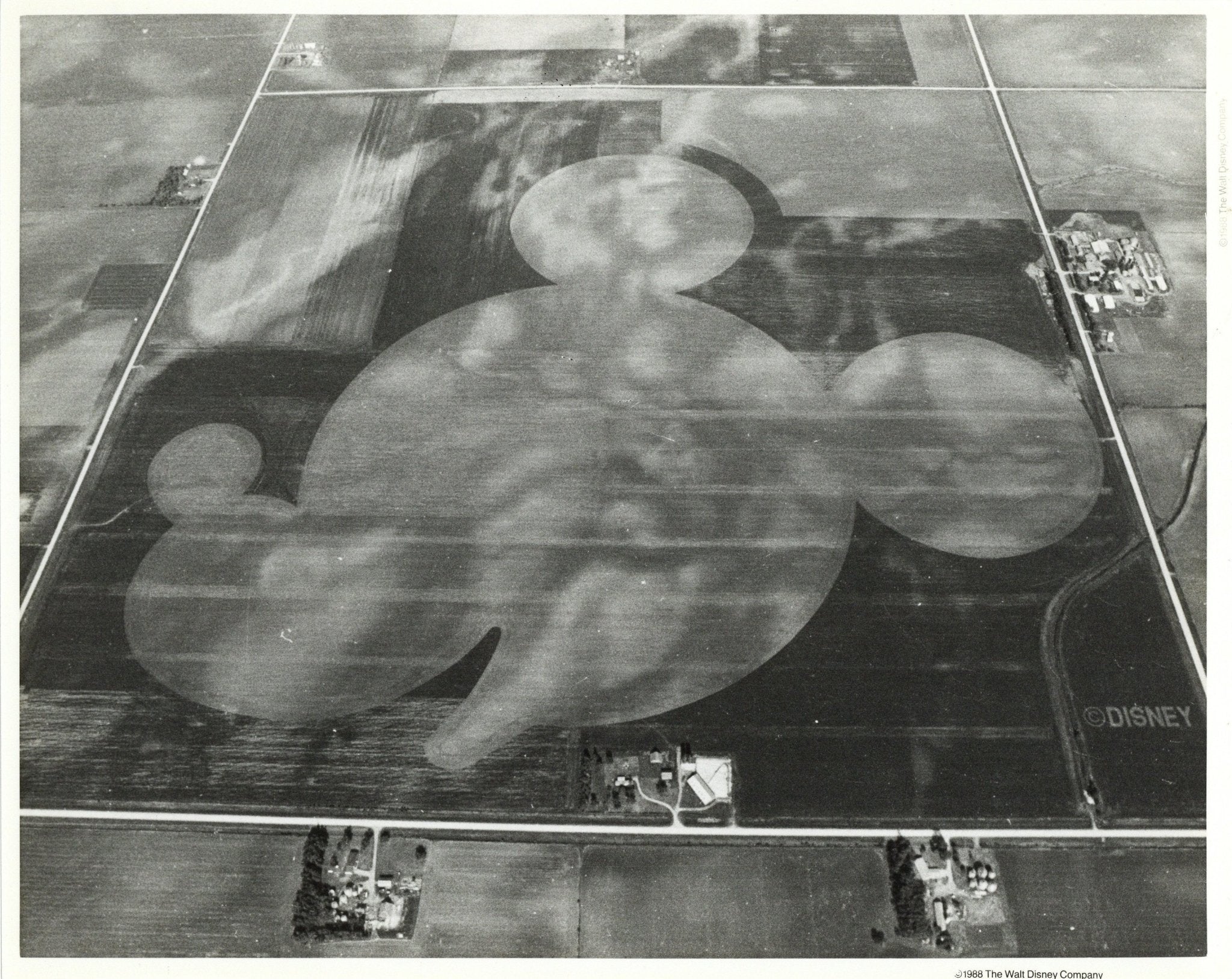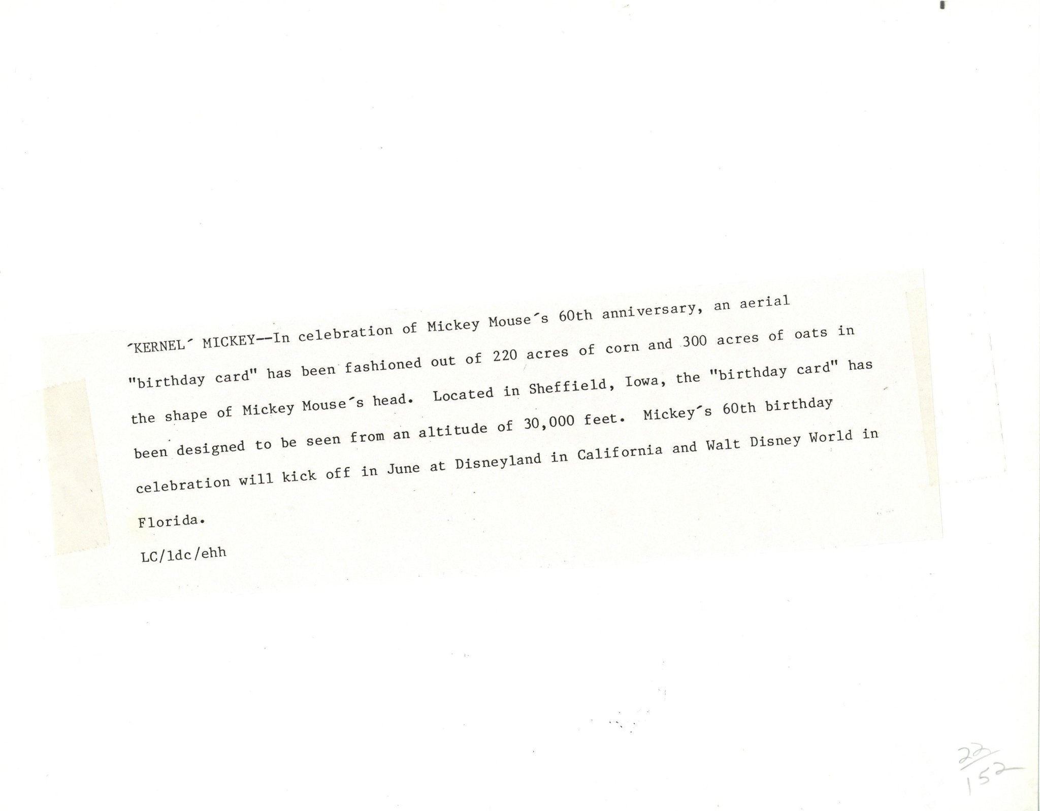 ABOUT THE IMAGE: "KERNEL MICKEY - In celebration of Mickey Mouse's 60th anniversary, an aerial "birthday card" has been fashioned out of 220 acres of corn and 300 acres of oats in