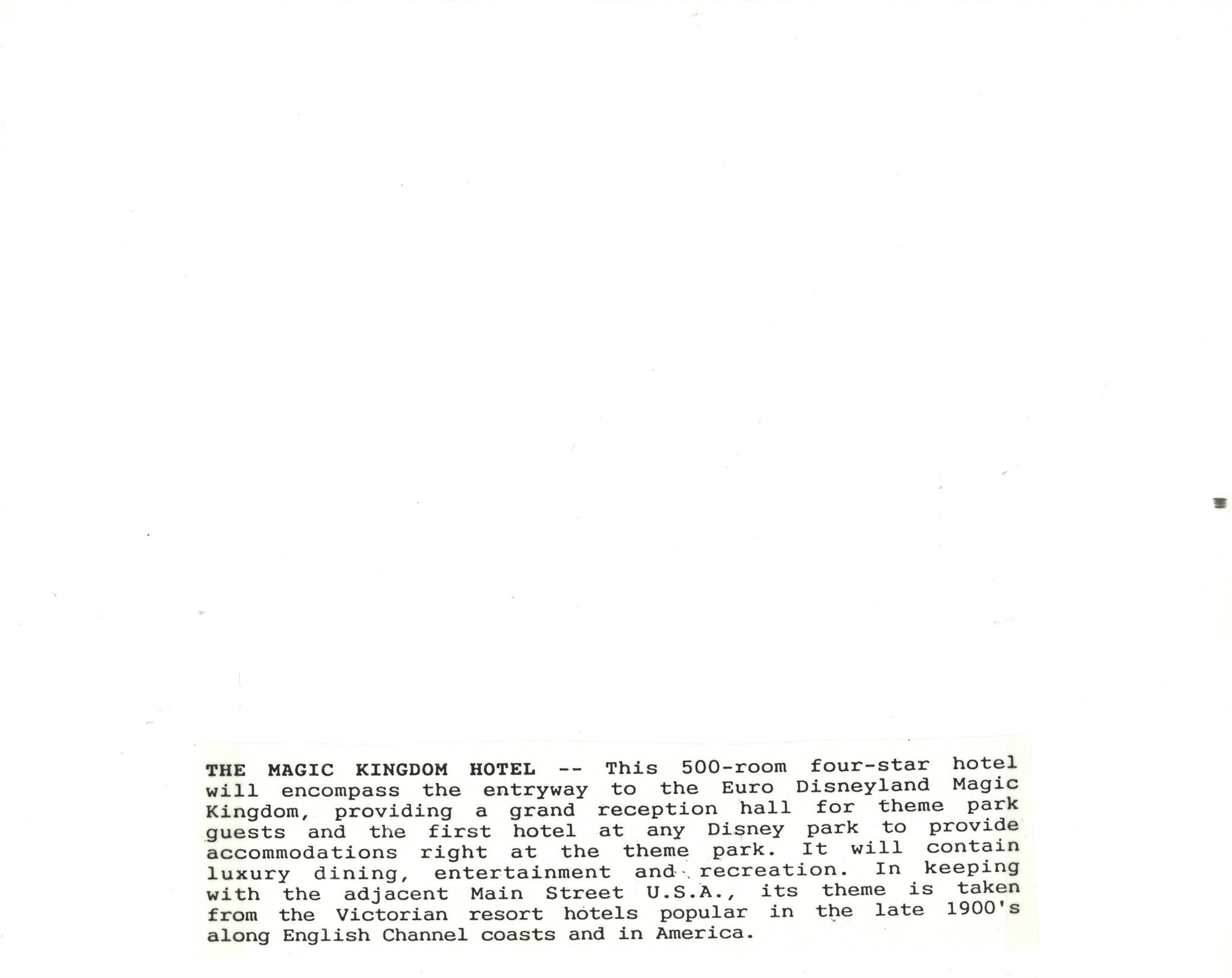 Disney Publicity Photo (1989): Magic Kingdom Hotel Concept