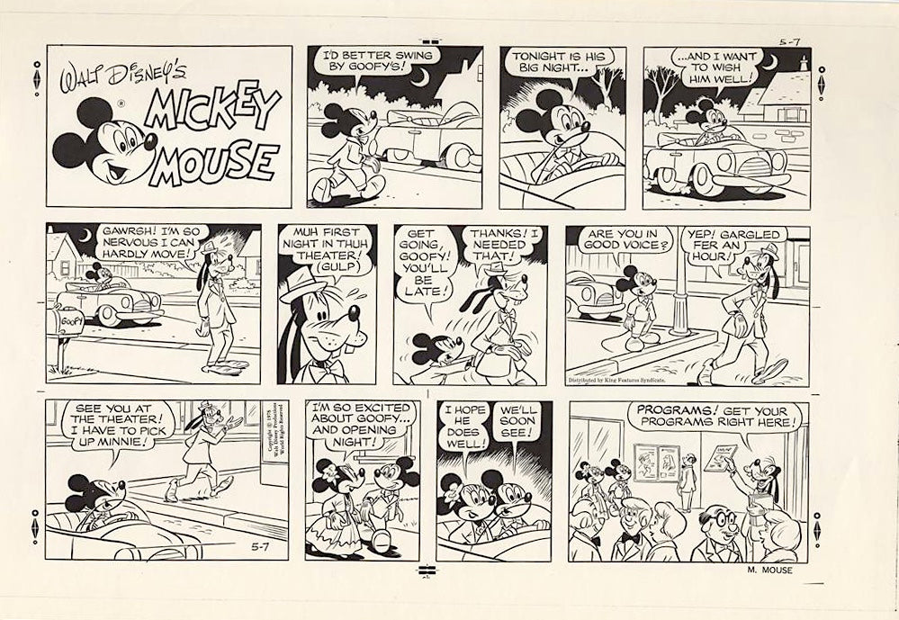 ABOUT THE IMAGE: This is artist-writer Del Connell's polished original drawing in pencil for the Mickey Mouse Sunday comics page published in newspapers on May 7, 1978 along with a black-and-white proof sheet that was issued to newspapers carrying the feature. It is Goofy's "first night in thuh theater" and Mickey and Minnie are there for "opening night."