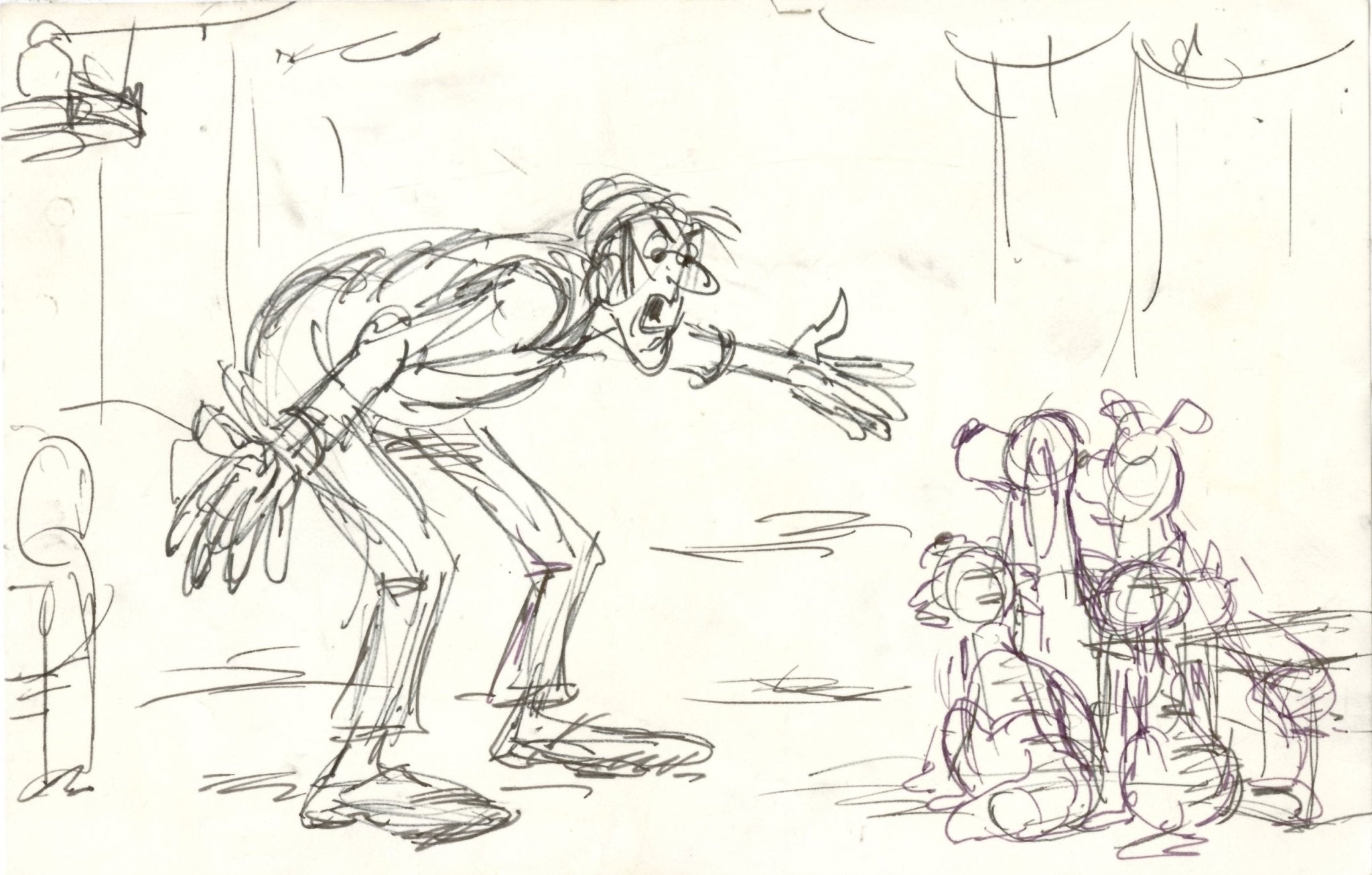 ABOUT THE IMAGE: This storyboard from Oliver & Company was drawn by Ted Berman (1911 - 2001), longtime story artist and writer and co-director of The Fox and the Hound and The Black Cauldron. The film put a spin on the classic tale of Oliver Twist and was something new for Disney, a trial run for including extensive computer animation in their features and returning to a musical format for their animated films.
