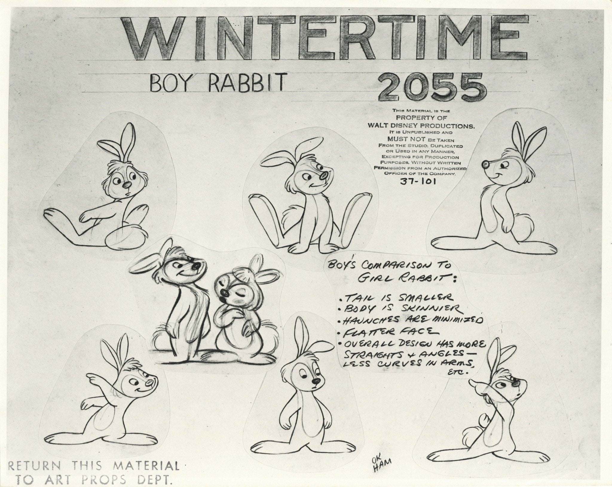 ABOUT THE MEDIUM: Photostat Model Sheets are reference guides used by animators to ensure consistency in character design, proportions, and expressions throughout a film. These printed sheets typically feature multiple poses, facial expressions, and turnarounds of a character, often photocopied from finalized drawings by lead animators. Model sheets help maintain uniformity in animation by providing a standard reference for all artists working on a character, preventing visual discrepancies between different scenes.