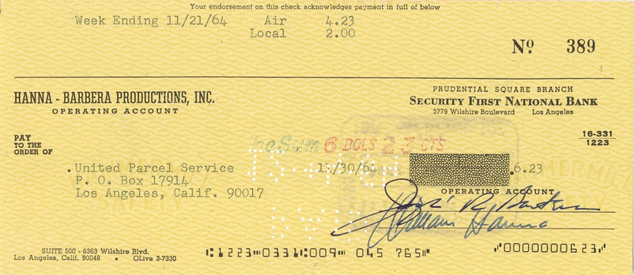 MEDIUM: Original Production Drawing, Check Signed by William Hanna and Joe Barbera