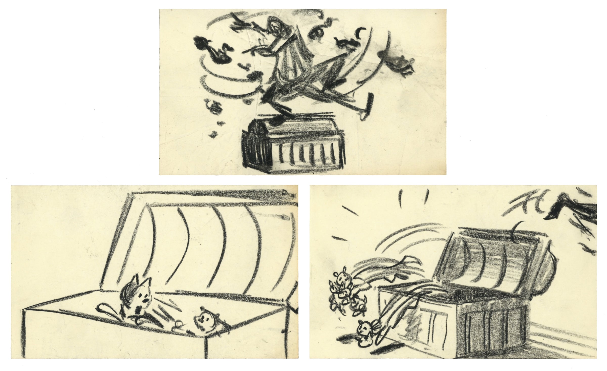 ABOUT THE IMAGE: These storyboards showcase the creativity involved in the making of The Aristocats. They were created for climactic sequence starting at about 1:12:52 when Edgar locks Duchess and her kittens in a trunk, ready to ship them off for good. O'Malley, Roquefort, Frau, and even Scat Cat and the Alley Cats help to stop him and make sure he's the one who is sent to Timbuktu. The artist of these storyboards is thought to be Vance Gerry (1929 - 2005), a storyboard, layout, and character artist at Disney for nearly 50 years.