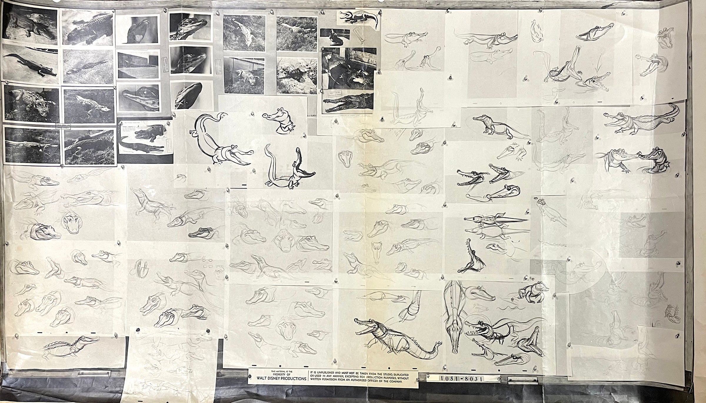 ABOUT THE IMAGE: When animating animals, Disney artists frequently studied live or photo reference to gain inspiration and accuracy. This photostat print displays a massive board of concept sketches and reference images for Tick-Tock, the crocodile from the 1953 film Peter Pan.