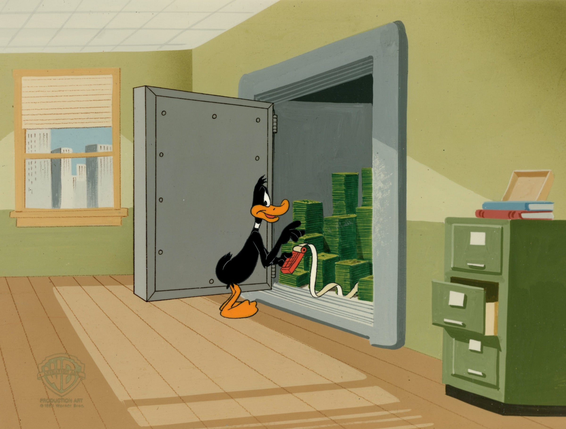 ABOUT THE IMAGE: In the animated feature "Daffy Duck's Quackbusters", wealthy J.P. Cubish has promised his fortune to anyone who can make him laugh. After Cubish dies, Daffy Duck, who won the job of personal court jester, lands the inheritance. The rub is that Cubish has demanded the person who receives his money use the funds for good. Daffy mocks the notion until Cubish's ghost starts haunting him. Determined to be rid of the spirit, Daffy recruits his friends -- Porky Pig, Bugs Bunny and others -- to start a ghost-busting service.  This piece comes with a certificate of authenticity.