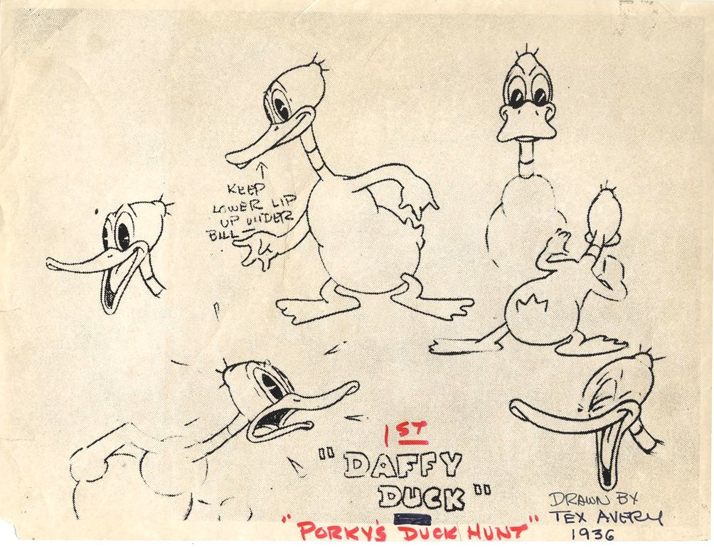 ABOUT THE IMAGE: This original model sheet was made at the Warner Bros. Studio in 1936 or 1937 during the production of the first or second cartoon to feature Daffy Duck; his unforgettable first (unnamed) appearance came in Porky's Duck Hunt, the Looney Tunes starring Daffy directed by Fred "Tex" Avery released in Spring, 1937. In his second cartoon—Daffy Duck and Egghead—Daffy acquired his name; it was released in January 1938 and also directed by Tex Avery.