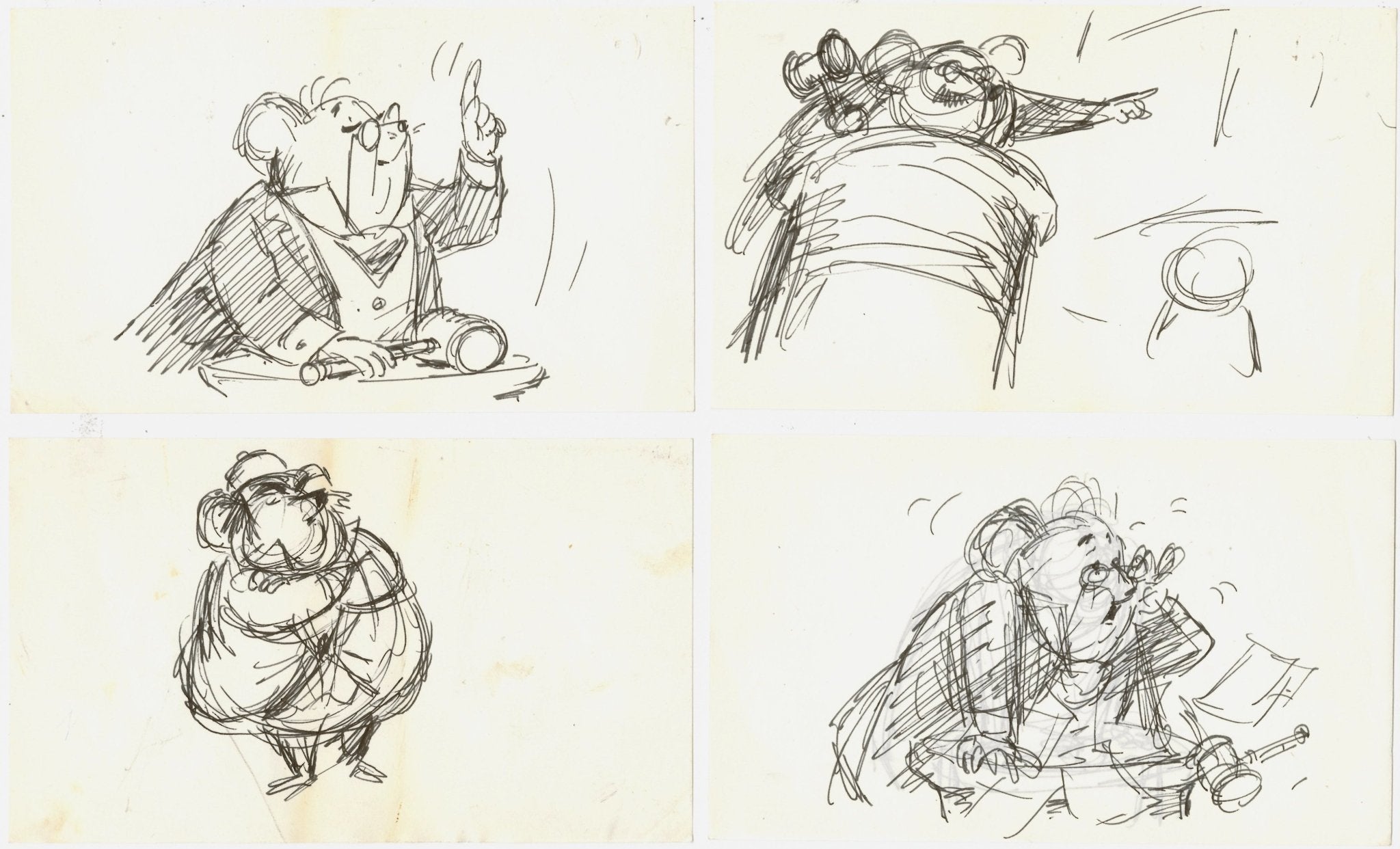 The storyboards were all created by the exceptional writer and story artist Ted Berman (1919 - 2001), who contributed to a variety of Disney films, shorts, and featurettes including The Black Cauldron and The Fox and the Hound. The storyboards and prints were largely created for: the sequence at the beginning of the film with the Rescue Aid Society where Bernard and Bianca are introduced, starting at roughly 6:22; the chase sequence where Madame Medusa, Mr. Snoops, and Medusa's crocodiles hunt Bernard and Bianca, starting at around 46:49; and the fight sequence at about 1:09:31 when Ellie Mae and crew help Bernard and Bianca fight off Madame Medusa.