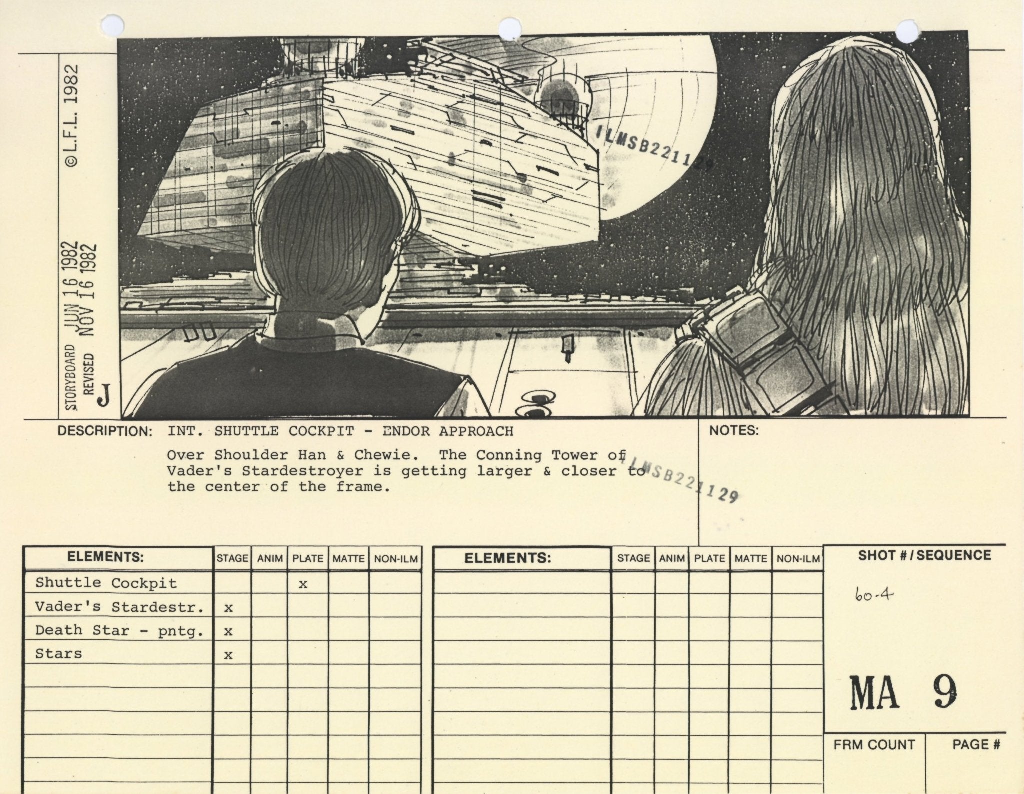 ABOUT THE ARTWORK: This photostat storyboard was used during the production of Star Wars: Episode VI - Return of the Jedi. Please note the two black "ILM" stamps and 3-ring binder peg holes along the upper margin. The artist, Joe Johnston, is denoted by the "J" near the lower left corner of the image. Johnston worked on all three films of the original Star Wars trilogy and was most notably the art director for both The Empire Strikes Back (1980) and Return of the Jedi (1983).