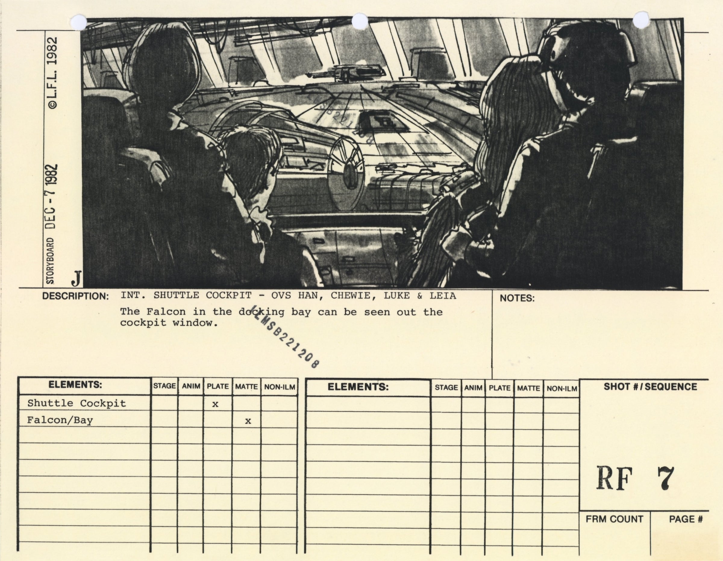 ABOUT THE ARTWORK: This photostat storyboard was used during the production of Star Wars: Episode VI - Return of the Jedi. Please note the two black "ILM" stamps and 3-ring binder peg holes along the upper margin. The artist, Joe Johnston, is denoted by the "J" near the lower left corner of the image. Johnston worked on all three films of the original Star Wars trilogy and was most notably the art director for both The Empire Strikes Back (1980) and Return of the Jedi (1983).