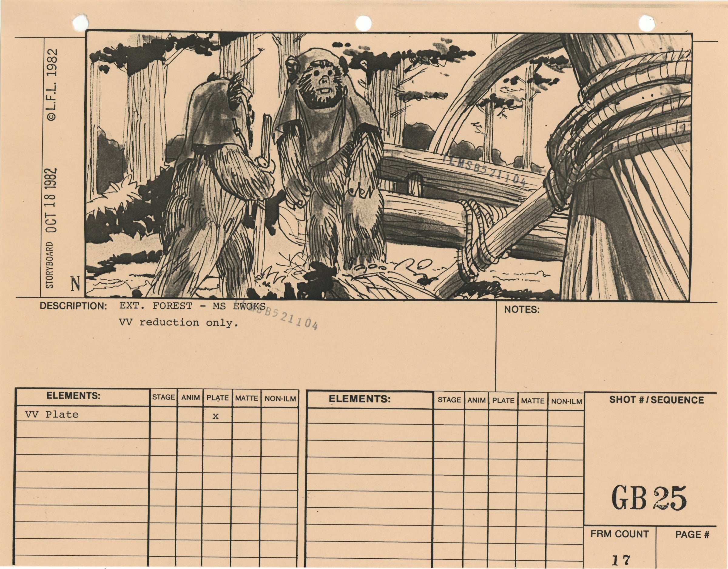 ABOUT THE ARTWORK: This photostat storyboard was used during the production of Star Wars: Episode VI - Return of the Jedi. Please note the two black "ILMSB521104" stamps as well as the 3-ring binder peg holes along the upper margin of this piece. The artist, Nilo Rodis-Jamero, is denoted by the "N" near the lower left corner of the image. Rodis-Jamero was the assistant art director of visual effects for Star Wars: Episode V - The Empire Strikes Back and costume designer for Star Wars: Episode VI - Return of the Jedi.