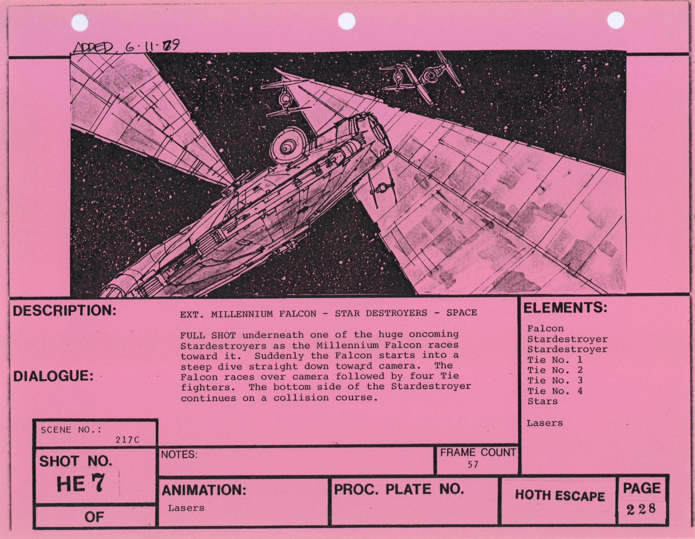ABOUT THE ART: This storyboard print comes from the collection of award-winning miniature and optical effects artist Lorne Peterson. Peterson was invited by fellow model maker John Dykstra to work in the miniature and optical effects department of George Lucas' Star Wars: A New Hope, where he helped design and build the Star Destroyers, Imperial TIE fighters, and other classic vehicles. During pre-production, Peterson, Dykstra, and their cohort of fellow artists working under Lucas co-founded effects company Industrial Light & Magic.