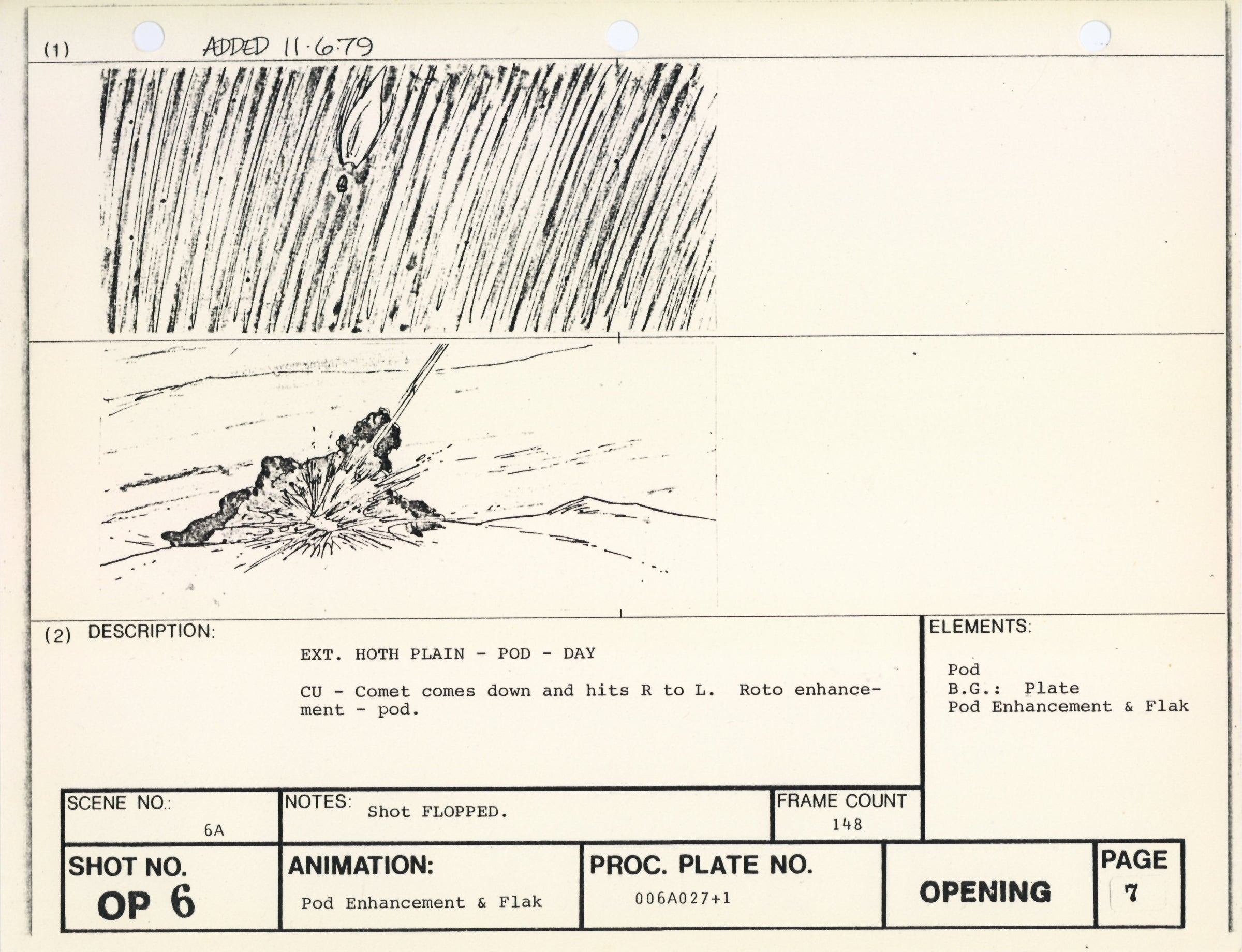 ABOUT THE ART: These storyboard prints come from the collection of award-winning miniature and optical effects artist Lorne Peterson. Peterson was invited by fellow model maker John Dykstra to work in the miniature and optical effects department of George Lucas' Star Wars: A New Hope, where he helped design and build the Star Destroyers, Imperial TIE fighters, and other classic vehicles. During pre-production, Peterson, Dykstra, and their cohort of fellow artists working under Lucas co-founded effects company Industrial Light & Magic.