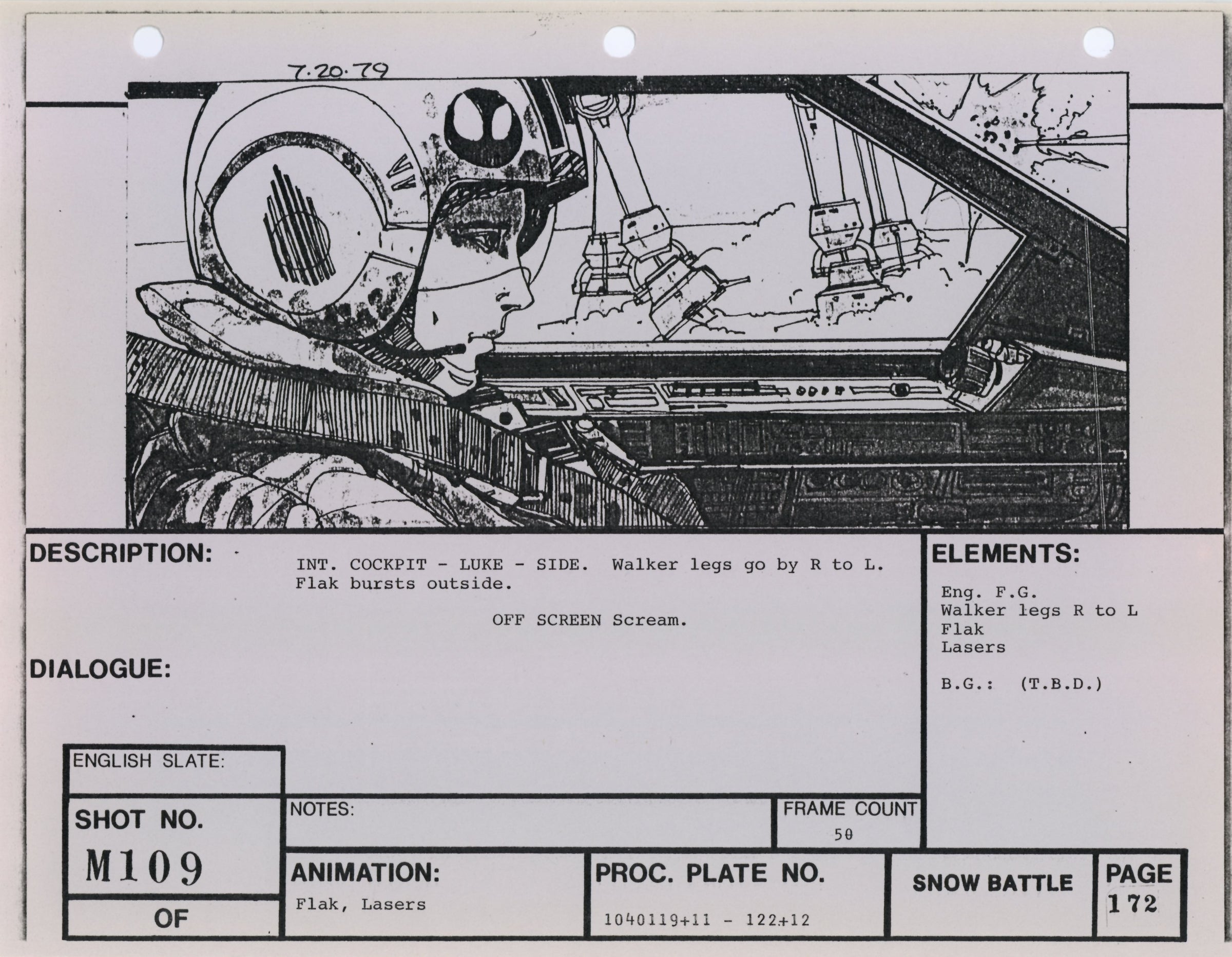 ABOUT THE ART: This storyboard print comes from the collection of award-winning miniature and optical effects artist Lorne Peterson. Peterson was invited by fellow model maker John Dykstra to work in the miniature and optical effects department of George Lucas' Star Wars: A New Hope, where he helped design and build the Star Destroyers, Imperial TIE fighters, and other classic vehicles. During pre-production, Peterson, Dykstra, and their cohort of fellow artists working under Lucas co-founded effects company Industrial Light & Magic.