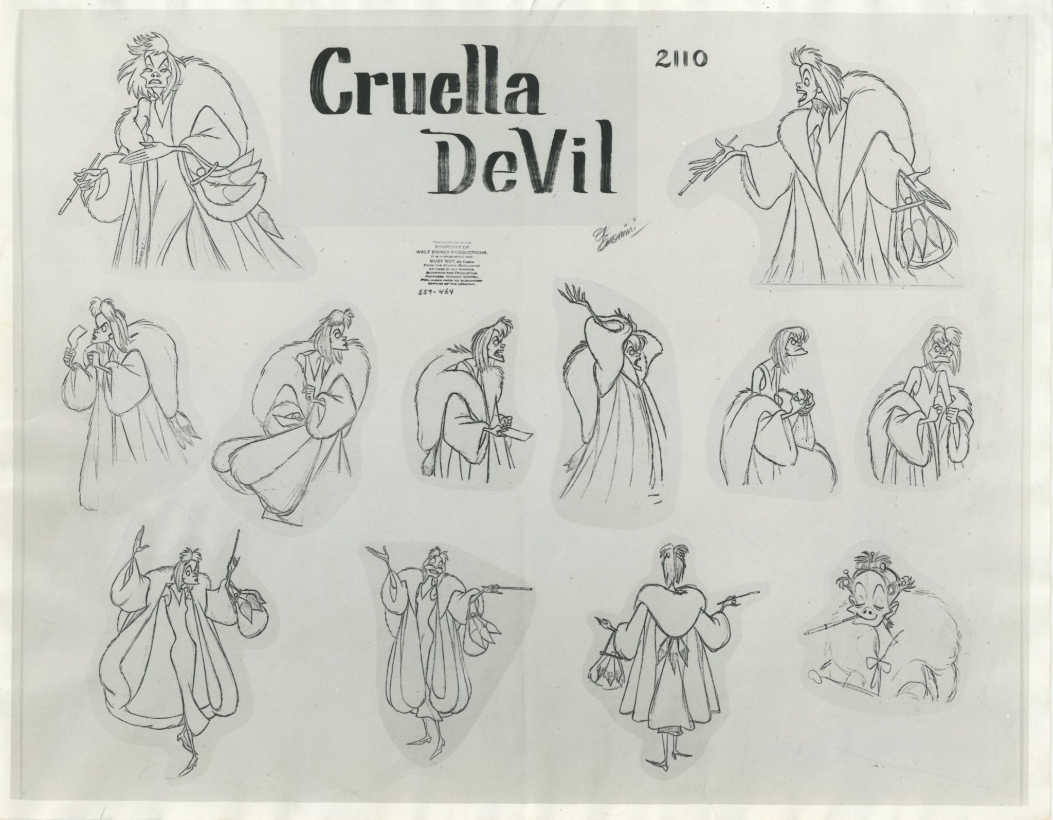 ABOUT THE MEDIUM: Photostat Model Sheets are reference guides used by animators to ensure consistency in character design, proportions, and expressions throughout a film. These printed sheets typically feature multiple poses, facial expressions, and turnarounds of a character, often photocopied from finalized drawings by lead animators. Model sheets help maintain uniformity in animation by providing a standard reference for all artists working on a character, preventing visual discrepancies between different scenes.