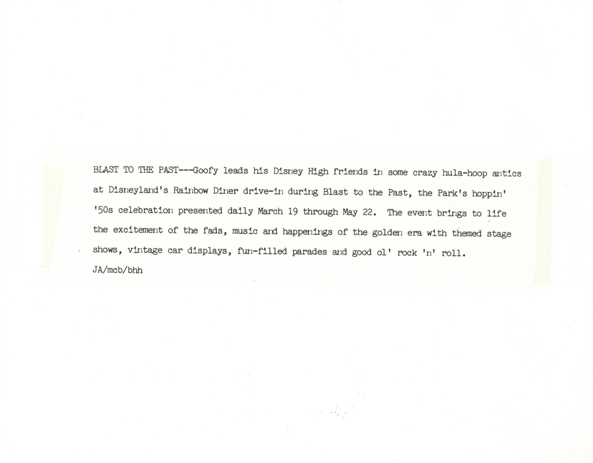 ABOUT THE IMAGE: "BLAST TO THE PAST--Goofy leads his Disney High friends In some crazy hula-hoop antics at Disneyland's Rainbow Diner drive-in during Blast to the Past, the Park's hoppin' '50s celebration presented daily March 19 through May 22. The event brings to life the excitement of the fads, music and happenings of the golden era with themed stage shows, vintage car displays, fun-filled parades and good ol' rock 'n' roll."