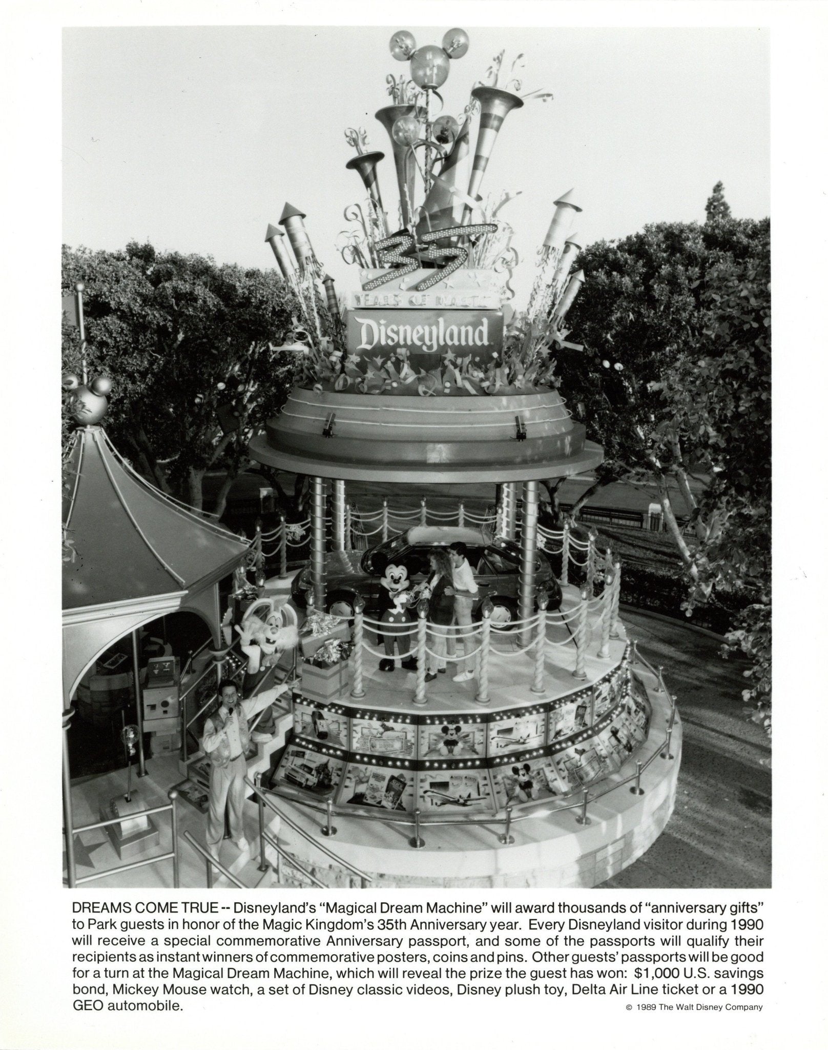 ABOUT THE IMAGE: DREAMS COME TRUE -- Disneyland's "Magical Dream Machine" will award thousands of "anniversary gifts" to Park guests in honor of the Magic Kingdom's 35th Anniversary year. Every Disneyland visitor during 1990 will receive a special commemorative Anniversary passport, and some of the passports will qualify their recipients as instant winners of commemorative posters, coins and pins. Other guests' passports will be good for a turn at the Magical Dream Machine, which will reveal the prize the guest has won: $1,000 U.S. savings bond, Mickey Mouse watch, a set of Disney classic videos, Disney plush toy, Delta Air Line ticket or a 1990 GEO automobile.
