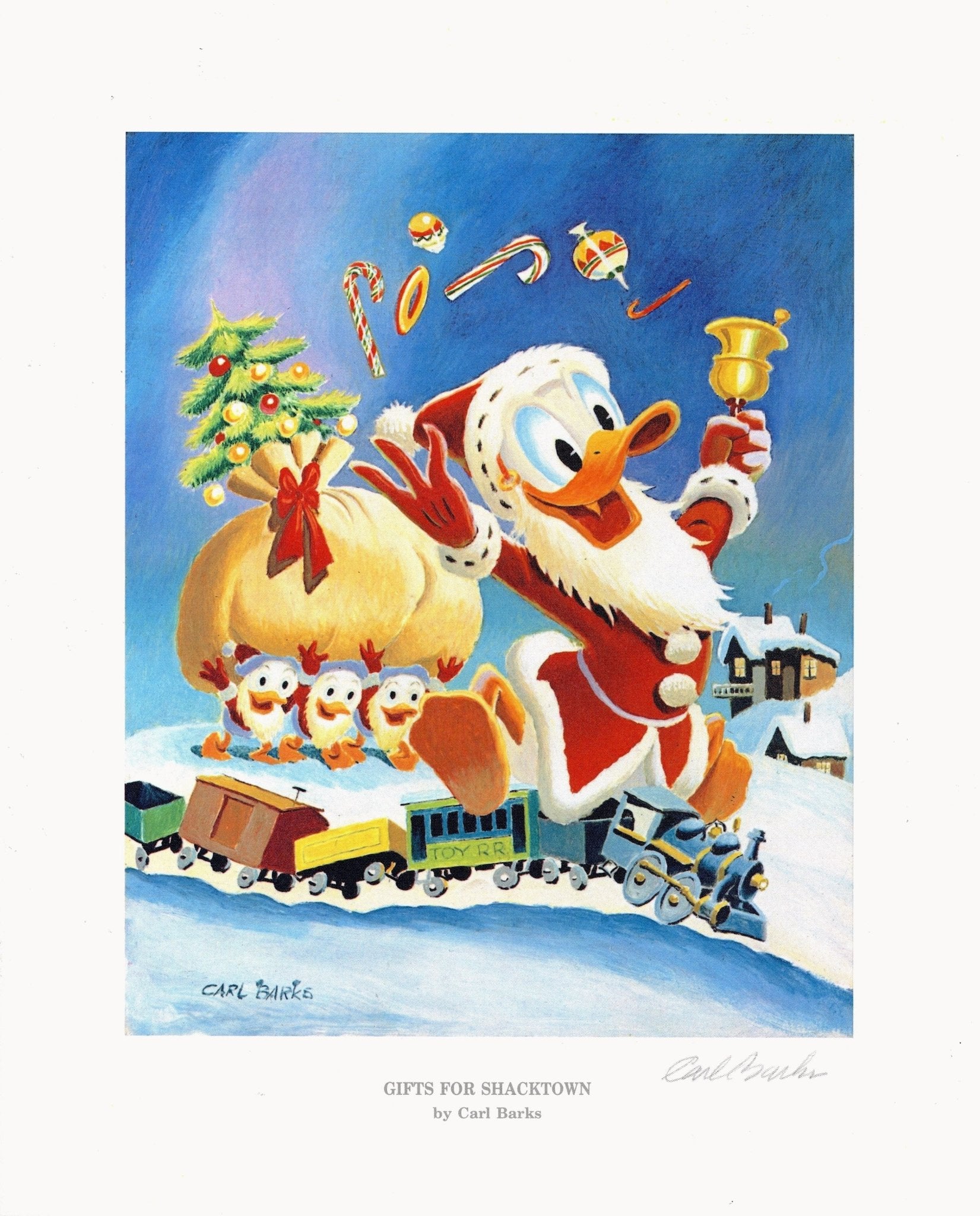 ABOUT THE IMAGE: Carl Barks' 1975 painting Gifts for Shacktown was issued by licensed Disney publisher Another Rainbow, Inc. as a high-quality lithograph in several limited, signed editions in 1991. This is an unnumbered print from approximately one hundred that were reserved for foreign release yet never numbered or distributed.