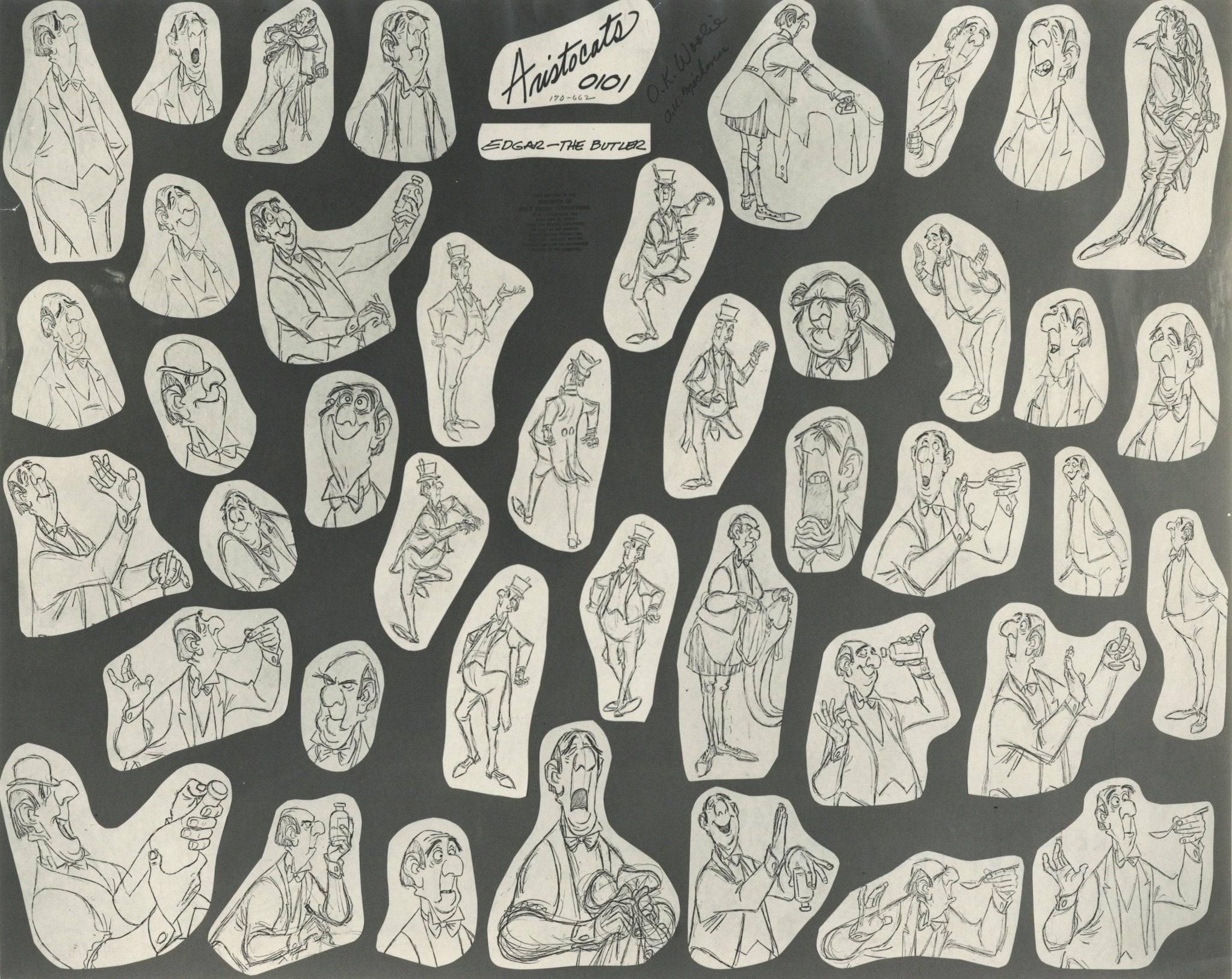 ABOUT THE IMAGE: A hand-written note from the film's director, Wolfgang Reitherman, reading "OK Woolie," has been reproduced at the top of this model sheet. Another note below it, "OK Michener" was written by character animator Dave Michener. The back of the piece has been hand-stamped and reads, "RETURN THIS MATERIAL TO ART PROPS DEPT."