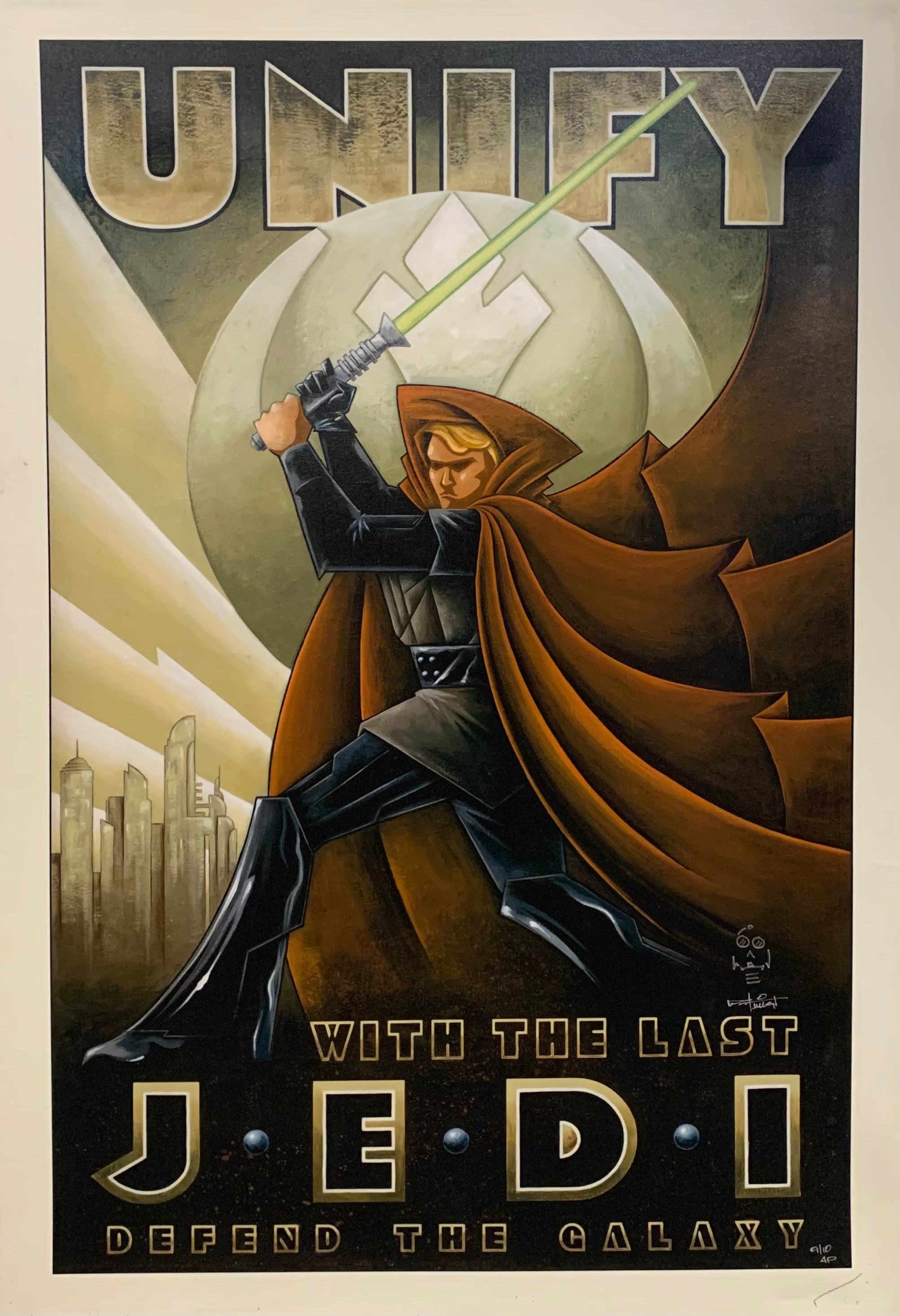 ABOUT THE ARTWORK: From artist Mike Kungl comes this stunning piece of Star Wars art that depicts an artistic representation of Luke Skywalker as a heroic mascot, wearing his cloak and wielding his lightsaber! This piece has been made to look like an old school propaganda poster for the Rebellion dramatically projecting the words "Unify with the last Jedi. Defend the Galaxy."