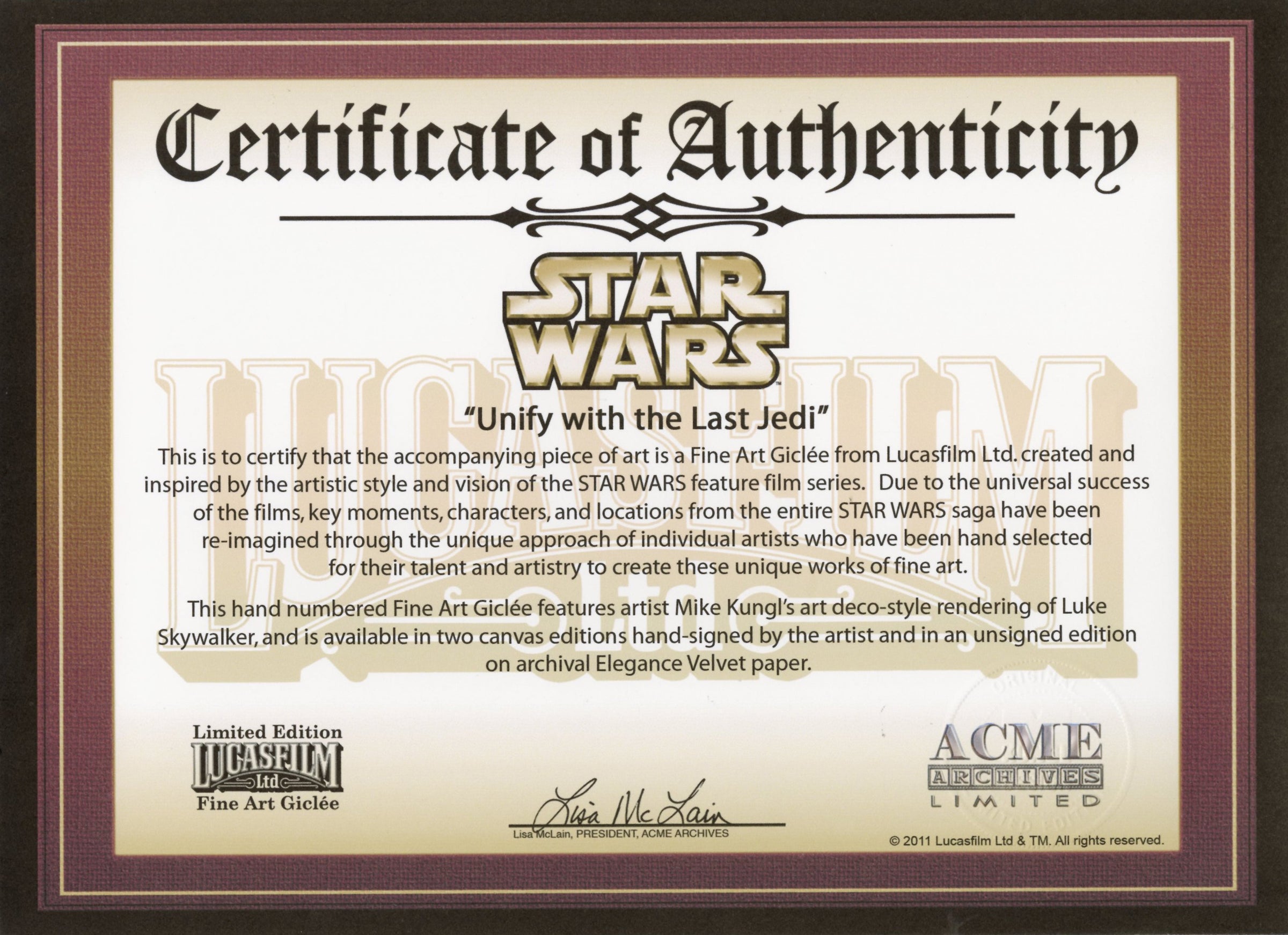 The Star Wars Art Collection presents today’s most talented artists in a series of Limited-Edition art that captures iconic scenes from Star Wars™ live-action movie films.  Each work of art brings beloved characters and stories to life with the interpretive and conceptual creativity of the artists - for us to collect and Enjoy!