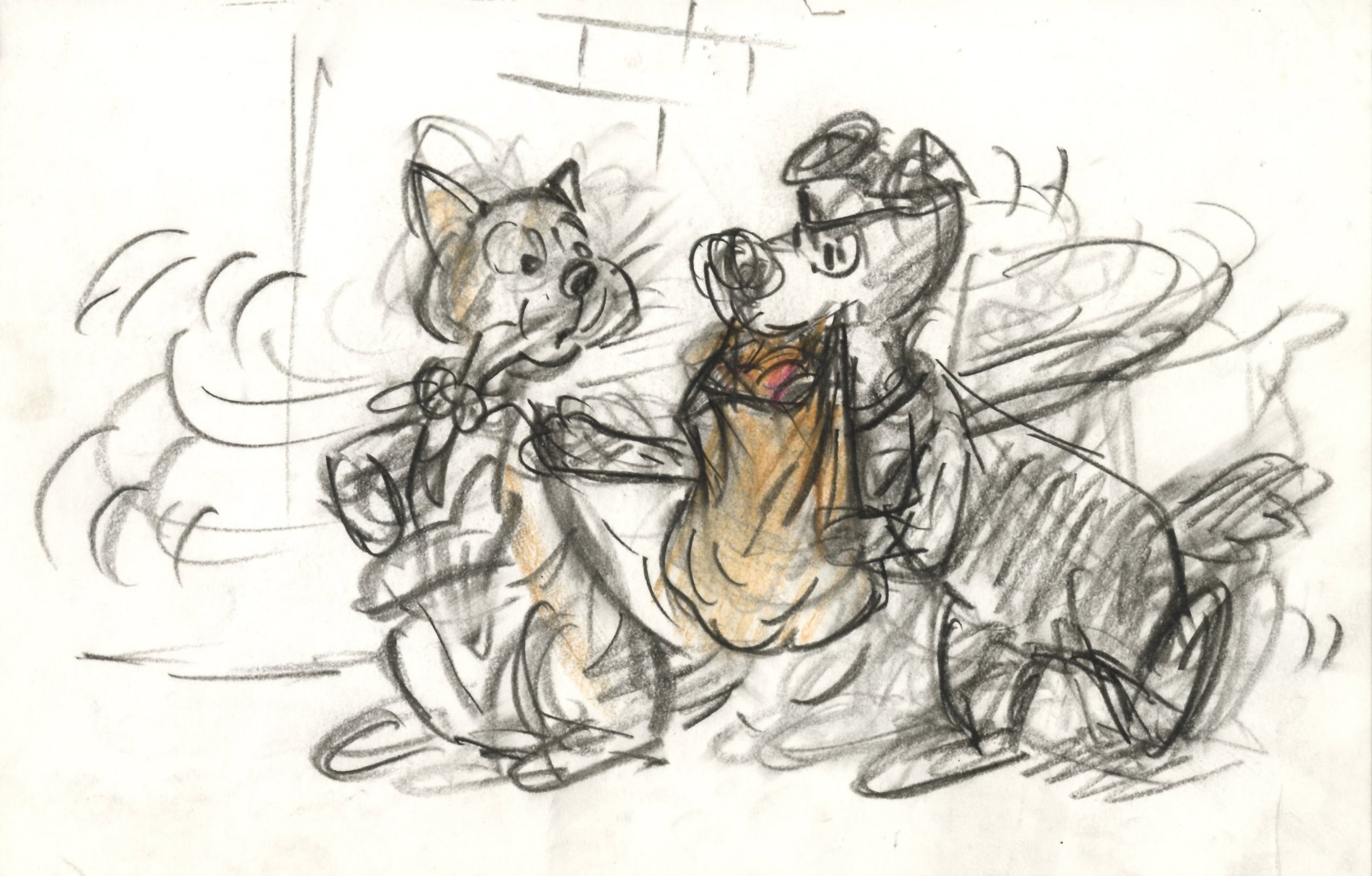 MEDIUM: Original Storyboard Drawing - Charcoal & Colored Pencil IMAGE SIZE: 8.5" x 5.5" PRODUCTION: Oliver & Company, 1988 SKU: CCV4340