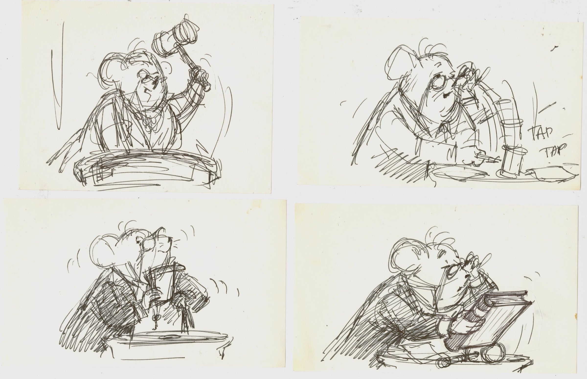 The storyboards were all created by the exceptional writer and story artist Ted Berman (1919 - 2001), who contributed to a variety of Disney films, shorts, and featurettes including The Black Cauldron and The Fox and the Hound. The storyboards and prints were largely created for: the sequence at the beginning of the film with the Rescue Aid Society where Bernard and Bianca are introduced, starting at roughly 6:22; the chase sequence where Madame Medusa, Mr. Snoops, and Medusa's crocodiles hunt Bernard and Bianca, starting at around 46:49; and the fight sequence at about 1:09:31 when Ellie Mae and crew help Bernard and Bianca fight off Madame Medusa.
