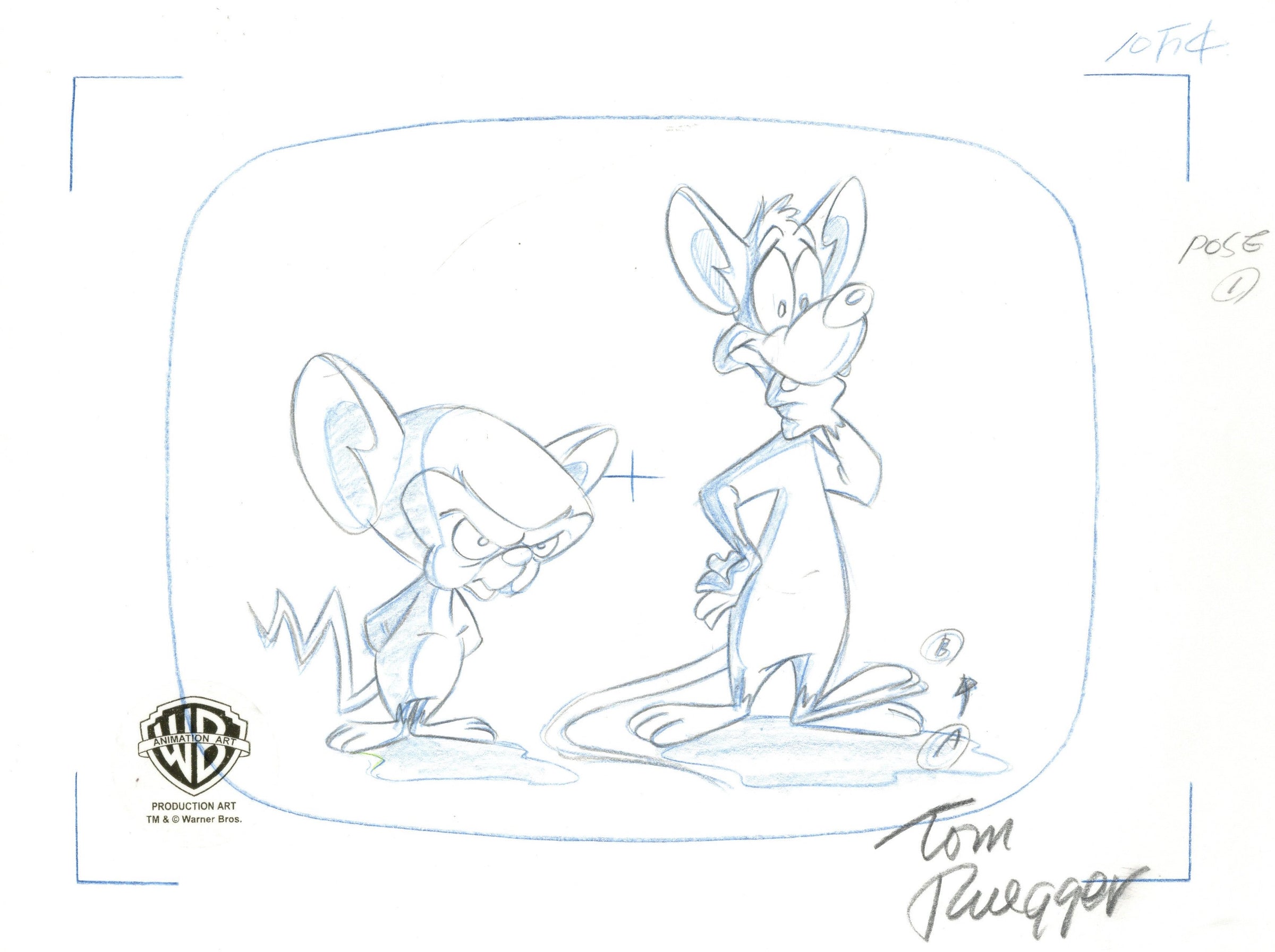ABOUT THE IMAGE: Pinky and the Brain is a cartoon that follows a self-proclaimed genius, The Brain, and his dimwitted sidekick, Pinky, as they try to conquer the world. Pinky and the Brain was the first animated television series to be presented in Dolby Surround. It was created by Tom Ruegger and the fourth collaboration between Steven Spielberg's production company, Amblin Entertainment and Warner Bros. Animation. The characters first appeared in 1993 as a recurring skit on the show Animaniacs. Thanks to its popularity it was later spun off as a series. There were 66 episodes produced. This piece comes with a certificate of authenticity.