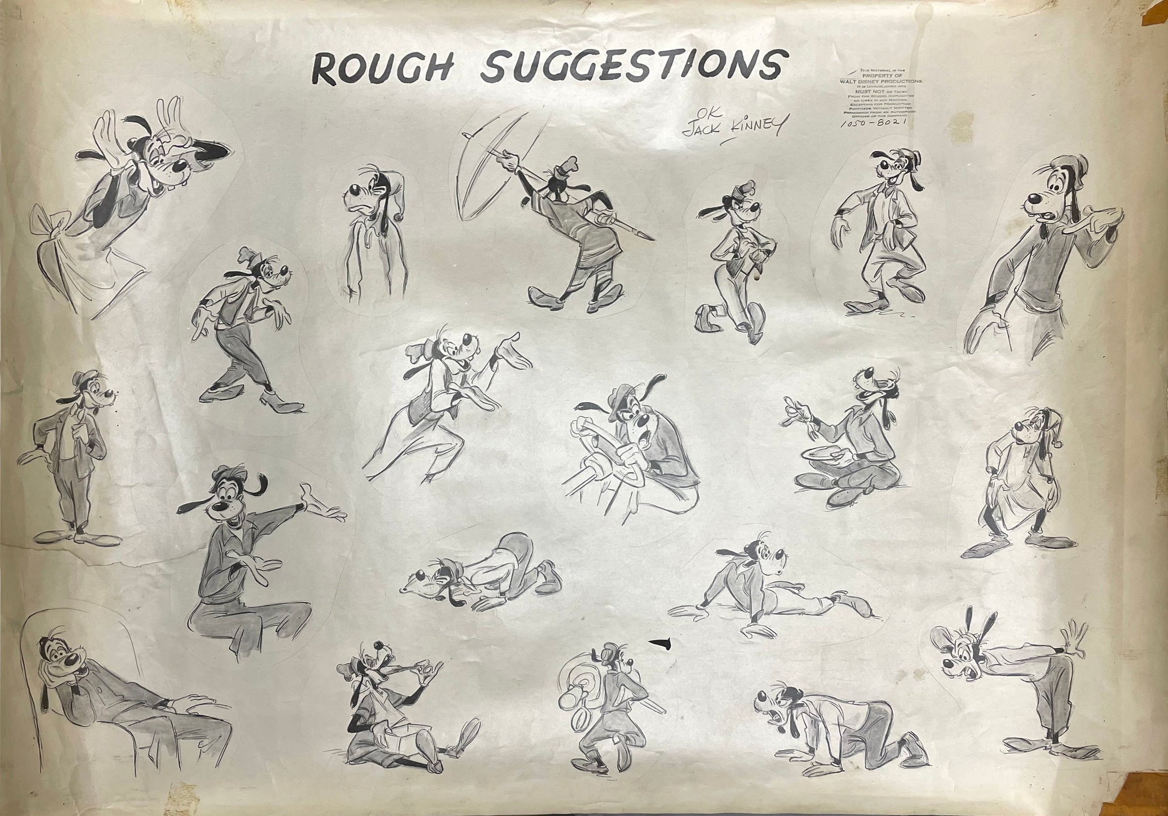 This photostat model sheet comes from the estate of veteran Disney animator and director Jack Kinney, who was awarded a Winsor McCay Award in 1983 in recognition for his lifetime contributions to animation. Kinney was the primary director of the Goofy series, responsible a total of 39 entries. His most notable creations were the Goofy How to... shorts, where the character demonstrated how to play various popular sports. Kinney also directed two entries in the Pluto series, as well as directing four entries in the Donald Duck series, including Der Fuehrer's Face (1943), a wartime satire of Adolf Hitler, which became the only Donald Duck short to win an Academy Award.