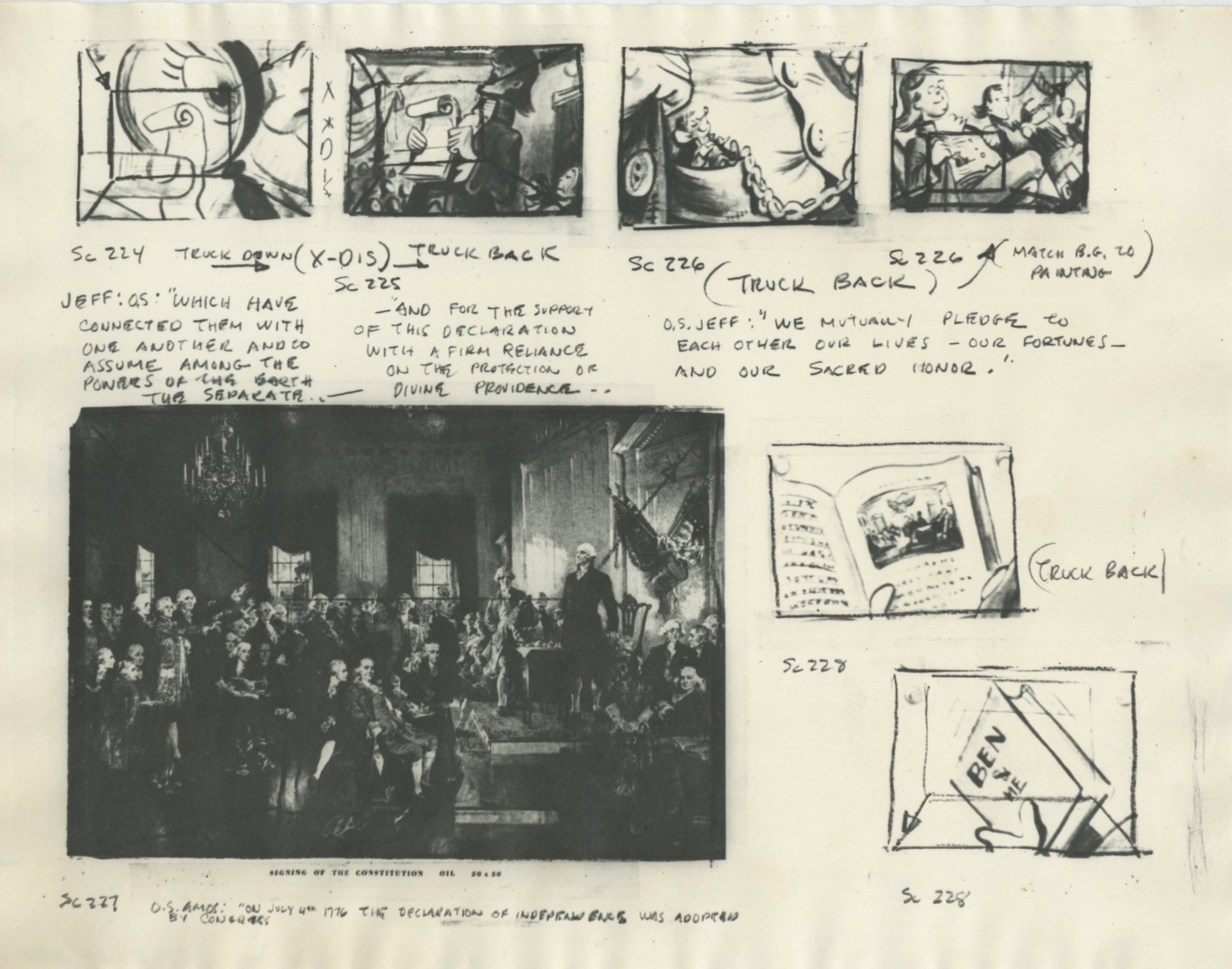 ABOUT THE MEDIUM: Storyboard Drawings show what’s moving in each shot, and in which direction, so that the production team is crystal clear on the desired end result. Photostat Storyboard Sheets are printed copies of the original storyboard drawings that were used by staff during the production of a film.