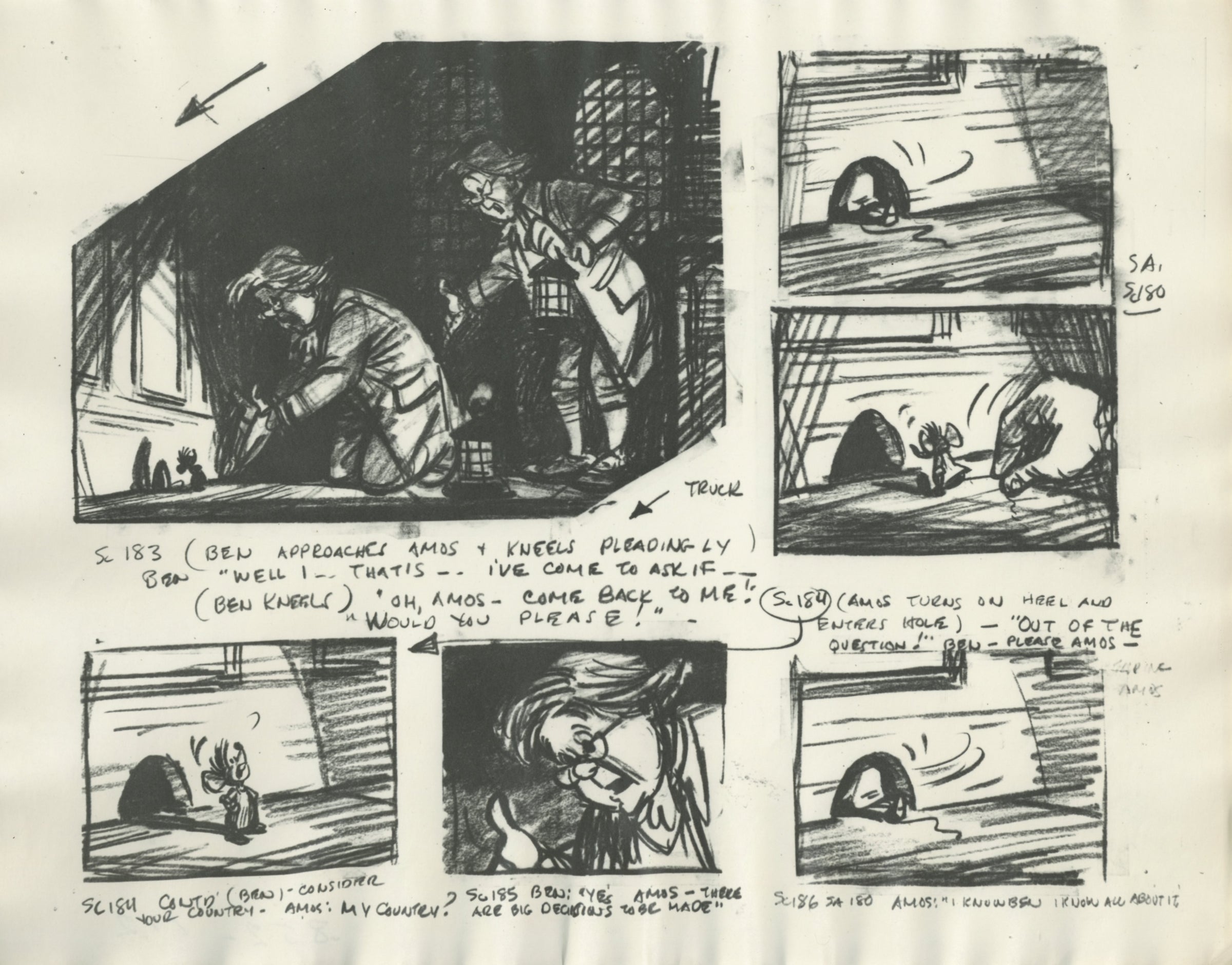 ABOUT THE MEDIUM: Storyboard Drawings show what’s moving in each shot, and in which direction, so that the production team is crystal clear on the desired end result. Photostat Storyboard Sheets are printed copies of the original storyboard drawings that were used by staff during the production of a film.