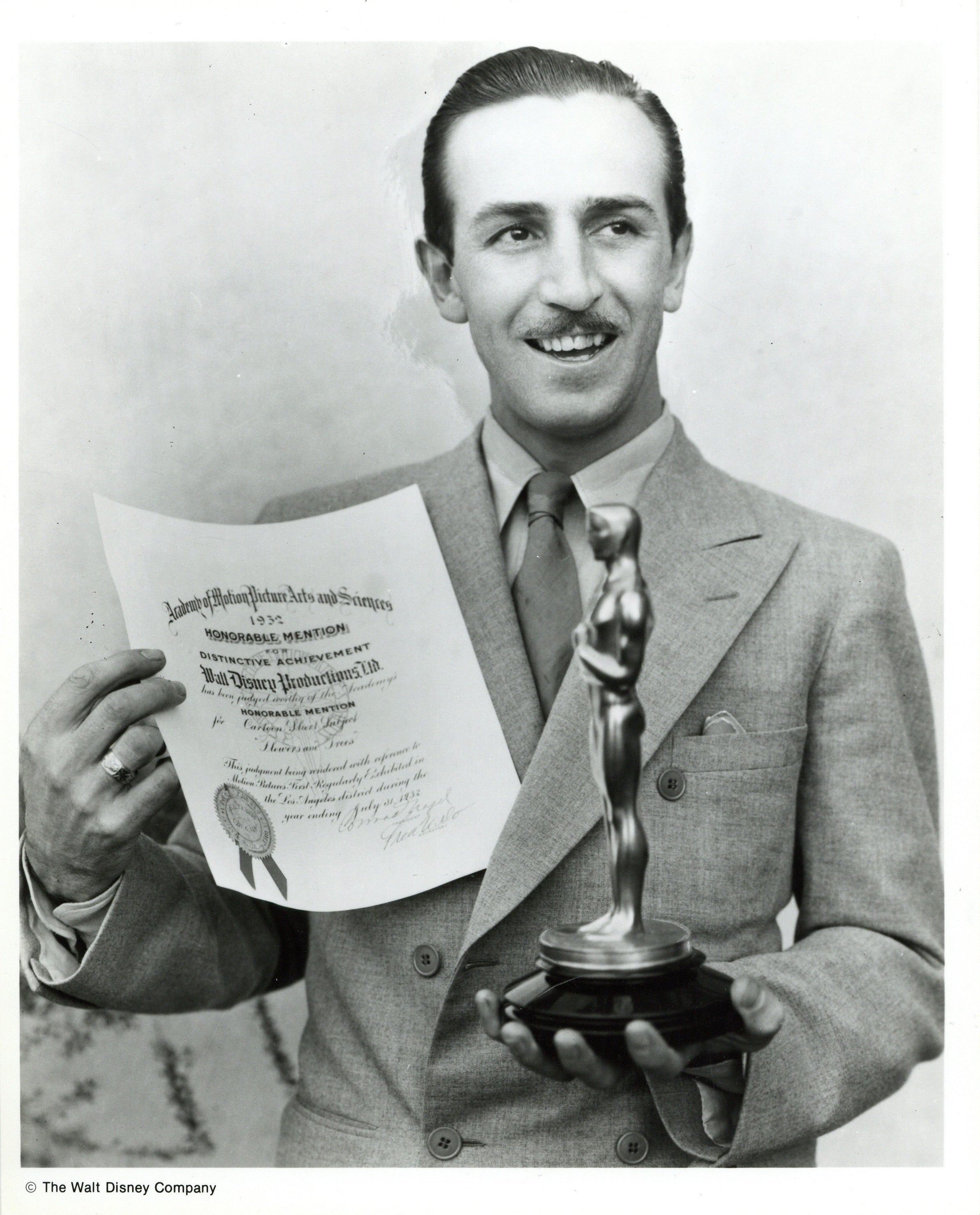 ABOUT THE IMAGE: This photo shows Walt Disney holding the certificate and statuette he received for his work producing the 1932 Silly Symphonies short, "Flowers and Trees." The film won Best Cartoon Short Subject at the 1933 Academy Awards.