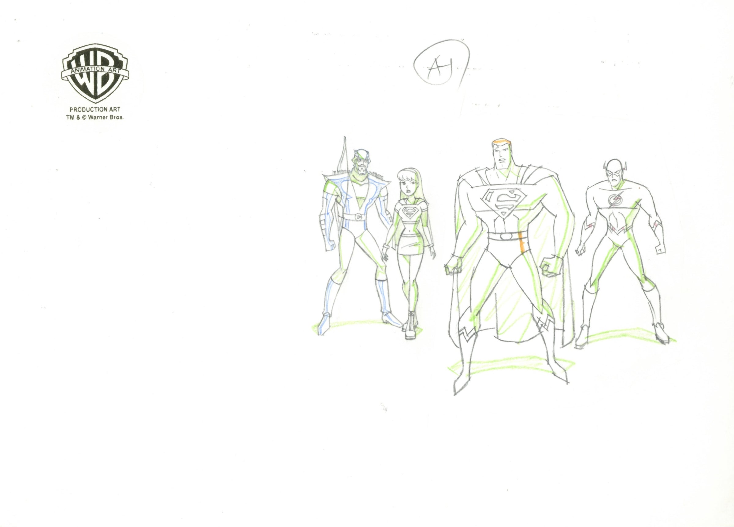 Justice League Unlimited Original Production Drawing Double Aperture: Martian Manhunter, Green Arrow, Supergirl, Superman, Flash