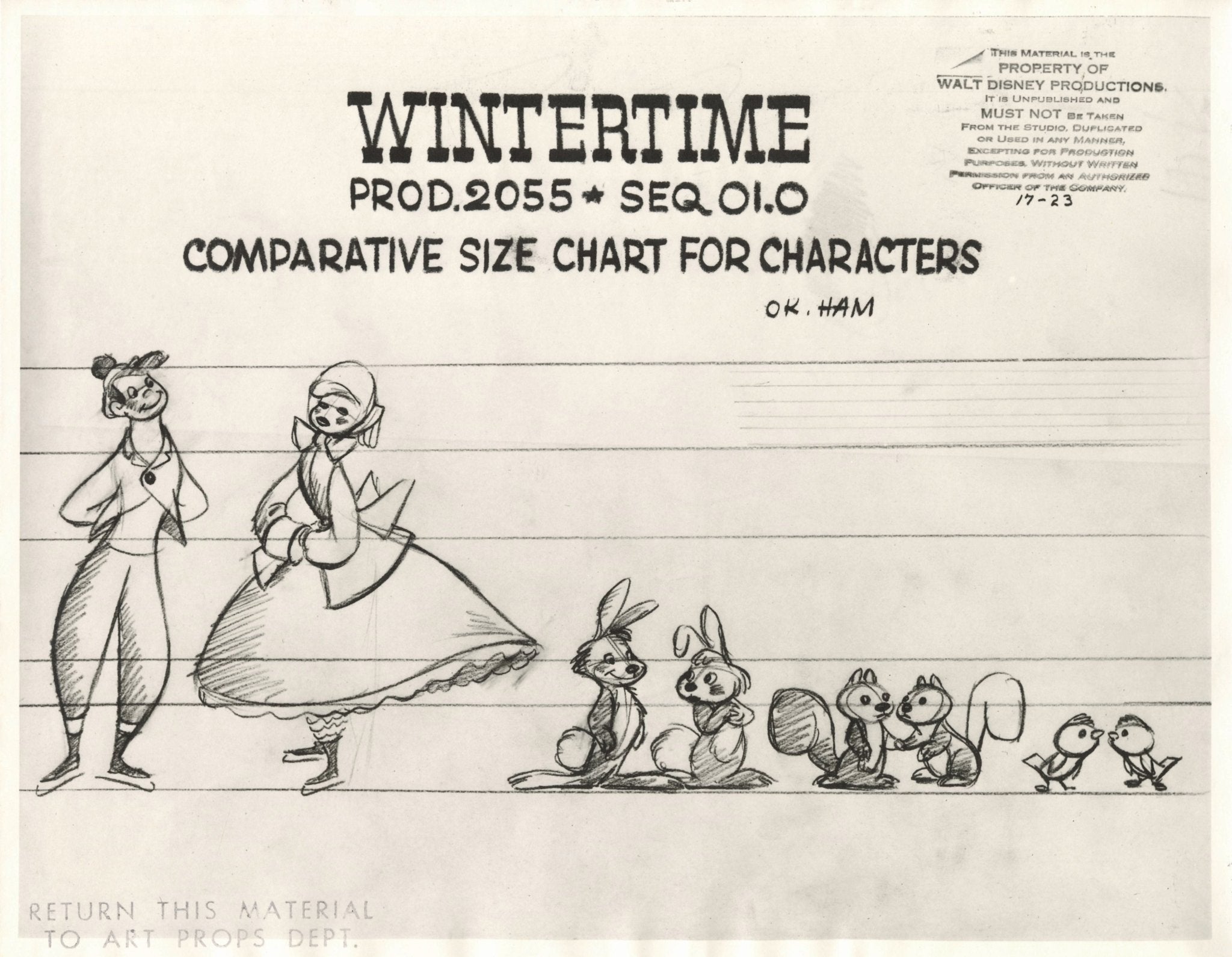 ABOUT THE MEDIUM: Photostat Model Sheets are reference guides used by animators to ensure consistency in character design, proportions, and expressions throughout a film. These printed sheets typically feature multiple poses, facial expressions, and turnarounds of a character, often photocopied from finalized drawings by lead animators. Model sheets help maintain uniformity in animation by providing a standard reference for all artists working on a character, preventing visual discrepancies between different scenes.