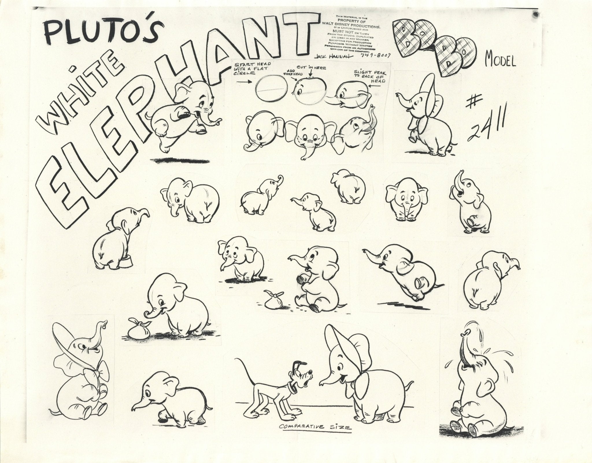 ABOUT THE IMAGE: This model sheet was printed for the unreleased Disney short film, "Pluto's White Elephant" (1948). Bobo the baby elephant previously appeared in the 1936 animated short "Mickey's Elephant."