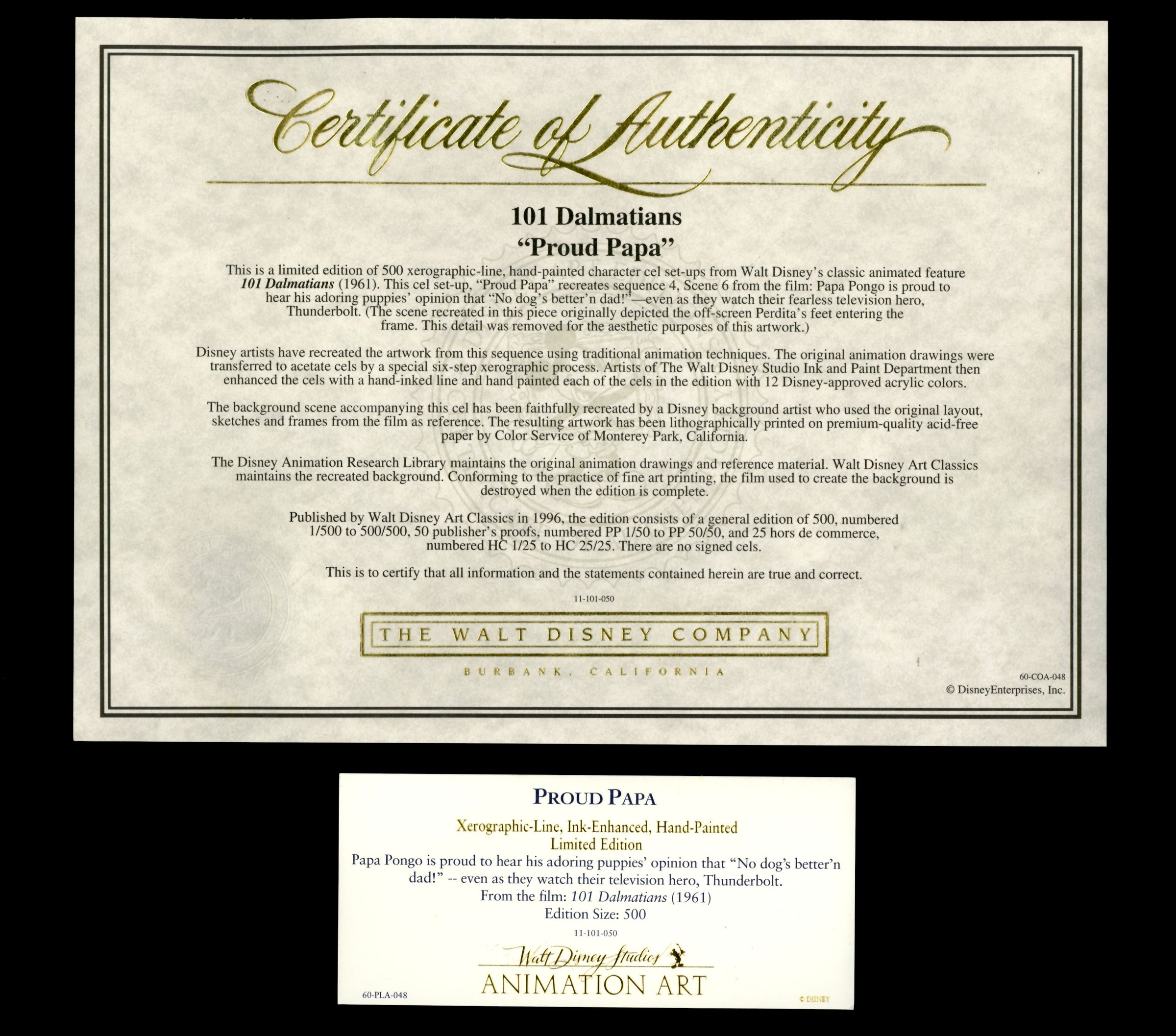 ABOUT THE IMAGE: "No dog is better than dad!" Here's a long-sold out limited edition cel #349/500 titled, "Proud Papa". This is from the scene when Pongo, Perdy and their 15 puppies are watching Thunderbolt on TV. You will see this image at or around the 22:03 mark. Directed by Disney Legends, Clyde Geronimi, Hamilton Luske, and Wolfgang Reitherman, 101 Dalmatians was the studio's 17th animated feature film. The film was a box office success, pulling the studio out of the financial slump caused by Sleeping Beauty, a costlier production released two years prior. This is a nice large image of 11", hand-painted on 16 field acetate at the Disney Ink and Paint Department in Burbank and paired with a lithographic print background.