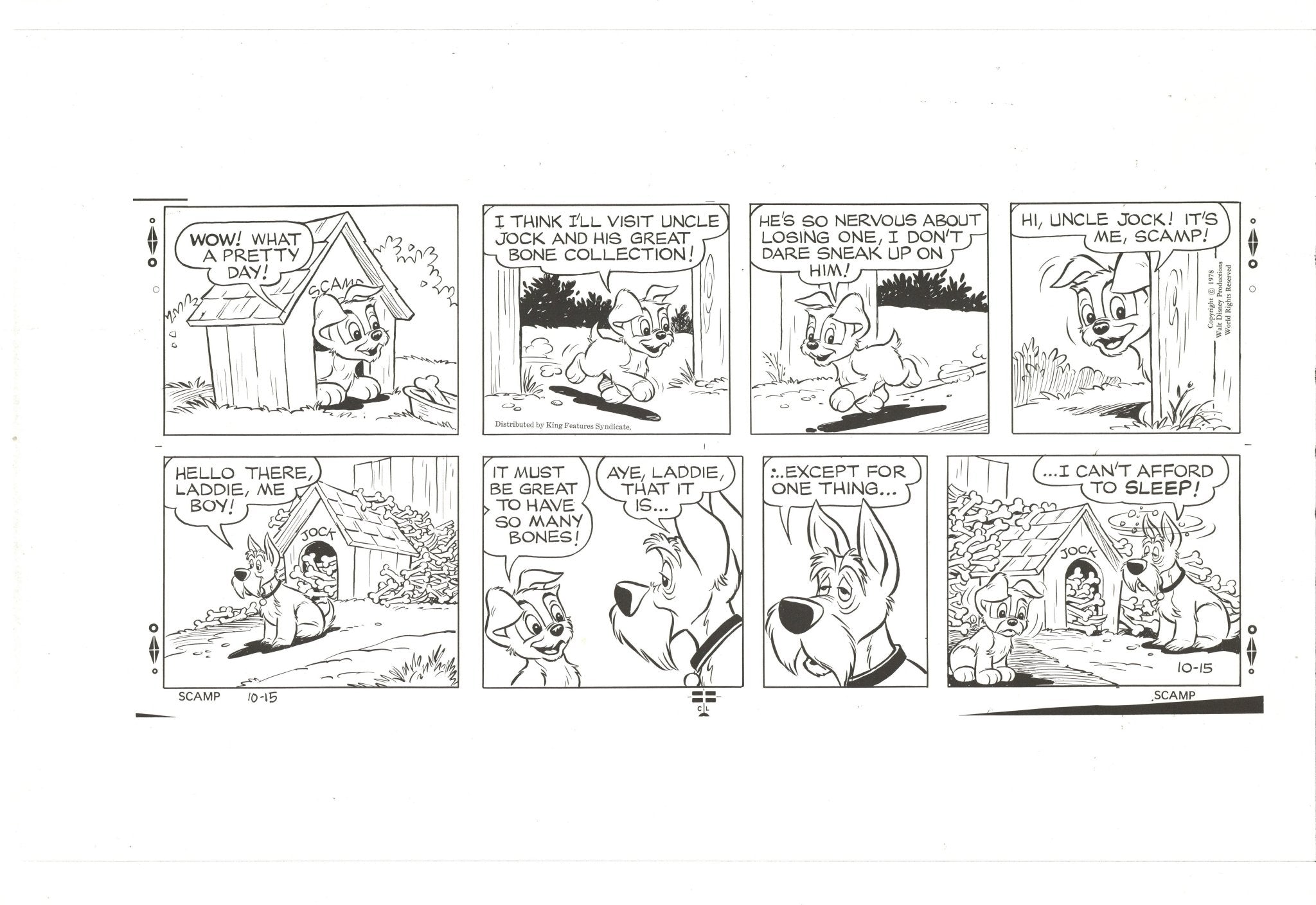 ABOUT THE IMAGE: This is artist-writer Bill Berg's lively original drawing for the Sunday comics episode published October 15th, 1978 with a copy of the black and white printed proof of the final version issued by King Features Syndicate to subscribing newspapers. This episode has tramp visitng "Uncle Jock" and his "great bone collection." The Scottish Terrier Jock featured prominently in the film Lady and the Tramp (1955) as Lady's neighbor and close friend. He and Trusty, the bloodhound, made rare appearances in the comic strip. "Oct. 15th" is written in red pencil and editor's "OK" in black in the top margin at left.