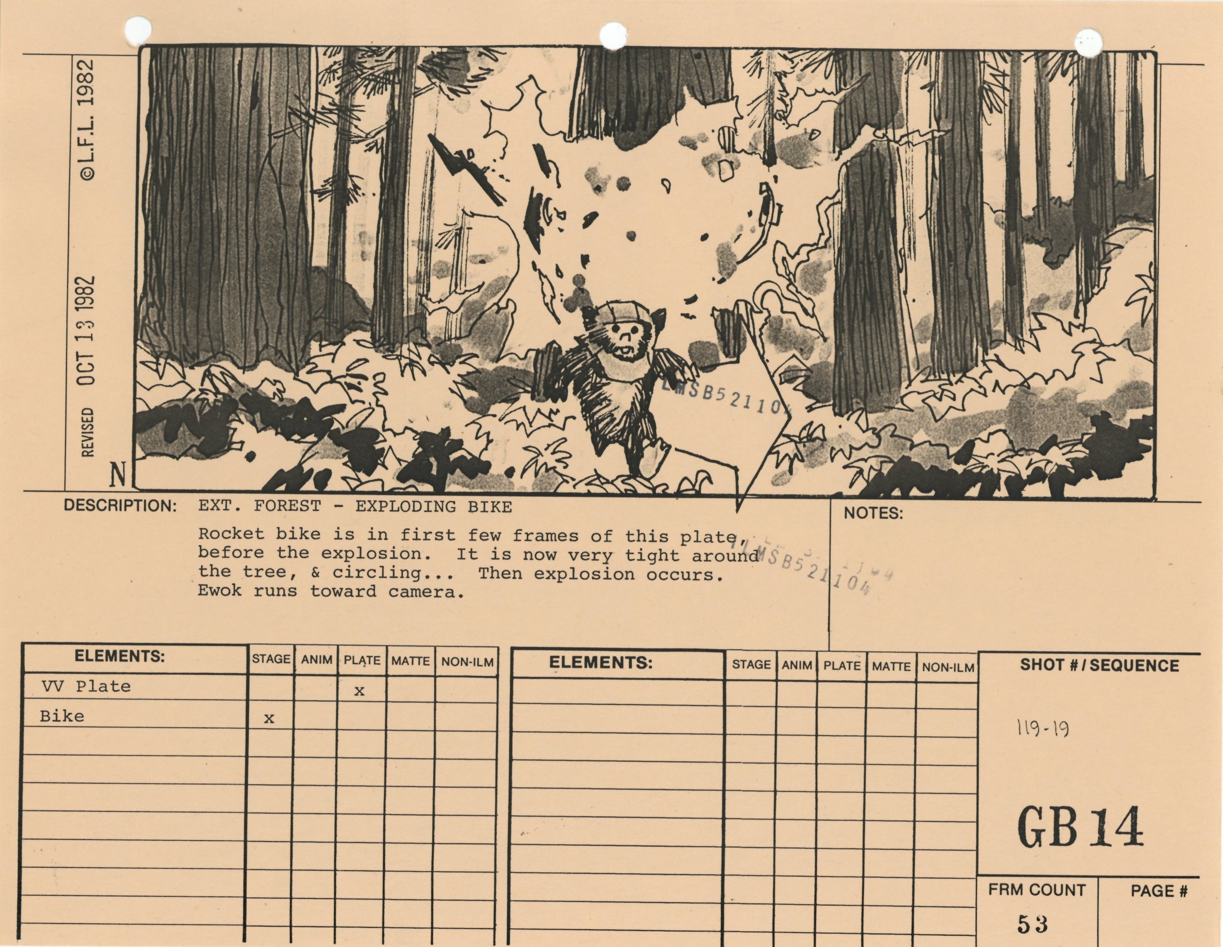 ABOUT THE ARTWORK: This photostat storyboard was used during the production of Star Wars: Episode VI - Return of the Jedi. Please note the two black "ILMSB521104" stamps as well as the 3-ring binder peg holes along the upper margin of this piece. The artist, Nilo Rodis-Jamero, is denoted by the "N" near the lower left corner of the image. Rodis-Jamero was the assistant art director of visual effects for Star Wars: Episode V - The Empire Strikes Back and costume designer for Star Wars: Episode VI - Return of the Jedi.