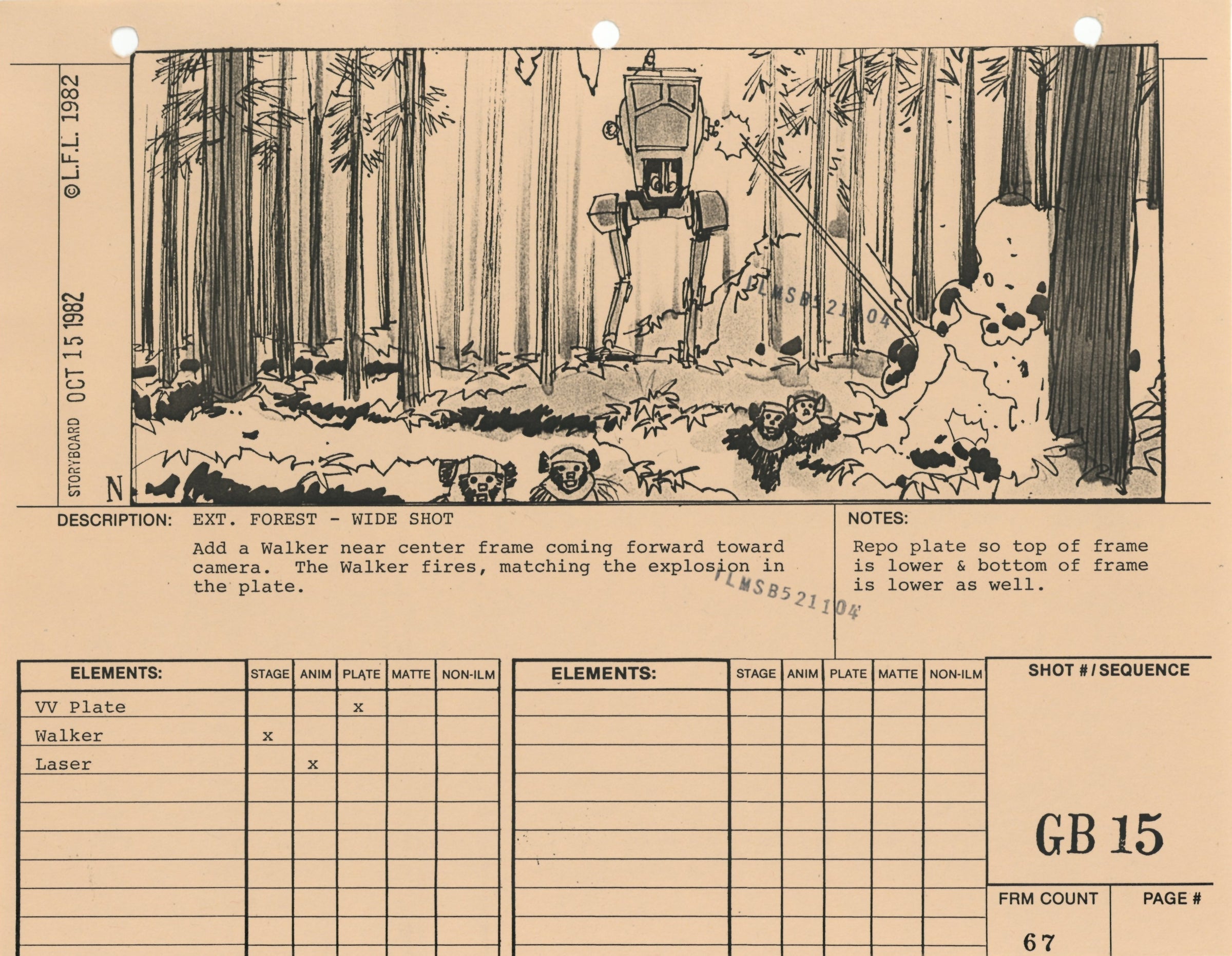 ABOUT THE ARTWORK: This photostat storyboard was used during the production of Star Wars: Episode VI - Return of the Jedi. Please note the two black "ILMSB521104" stamps as well as the 3-ring binder peg holes along the upper margin of this piece. The artist, Nilo Rodis-Jamero, is denoted by the "N" near the lower left corner of the image. Rodis-Jamero was the assistant art director of visual effects for Star Wars: Episode V - The Empire Strikes Back and costume designer for Star Wars: Episode VI - Return of the Jedi.