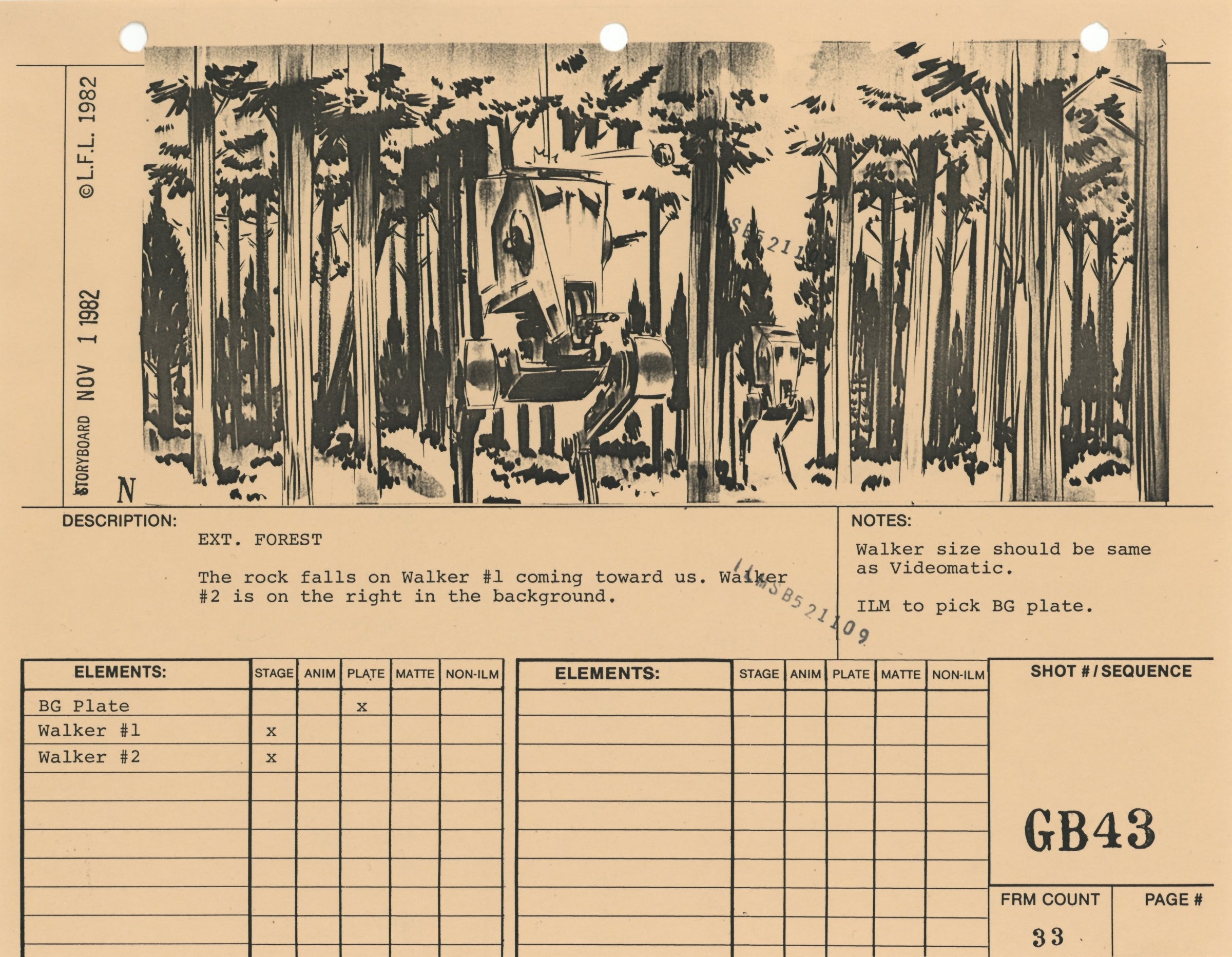 ABOUT THE ARTWORK: This photostat storyboard was used during the production of Star Wars: Episode VI - Return of the Jedi. Please note the two black "ILMSB521109" stamps as well as the 3-ring binder peg holes along the upper margin of this piece. The artist, Nilo Rodis-Jamero, is denoted by the "N" near the lower left corner of the image. Rodis-Jamero was the assistant art director of visual effects for Star Wars: Episode V - The Empire Strikes Back and costume designer for Star Wars: Episode VI - Return of the Jedi.