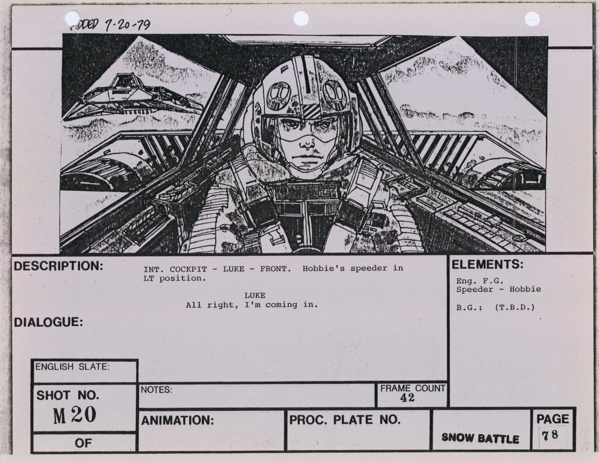 ABOUT THE ART: This storyboard print comes from the collection of award-winning miniature and optical effects artist Lorne Peterson. Peterson was invited by fellow model maker John Dykstra to work in the miniature and optical effects department of George Lucas' Star Wars: A New Hope, where he helped design and build the Star Destroyers, Imperial TIE fighters, and other classic vehicles. During pre-production, Peterson, Dykstra, and their cohort of fellow artists working under Lucas co-founded effects company Industrial Light & Magic.