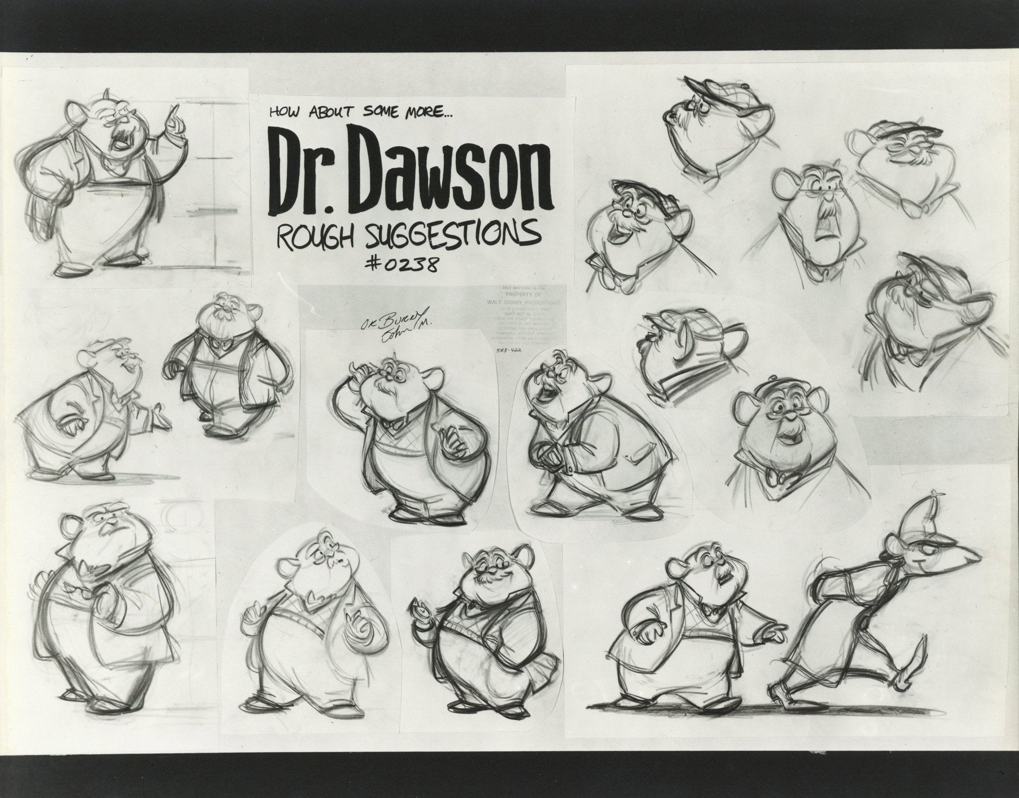 ABOUT THE MEDIUM: Photostat Model Sheets are reference guides used by animators to ensure consistency in character design, proportions, and expressions throughout a film. These printed sheets typically feature multiple poses, facial expressions, and turnarounds of a character, often photocopied from finalized drawings by lead animators. Model sheets help maintain uniformity in animation by providing a standard reference for all artists working on a character, preventing visual discrepancies between different scenes.