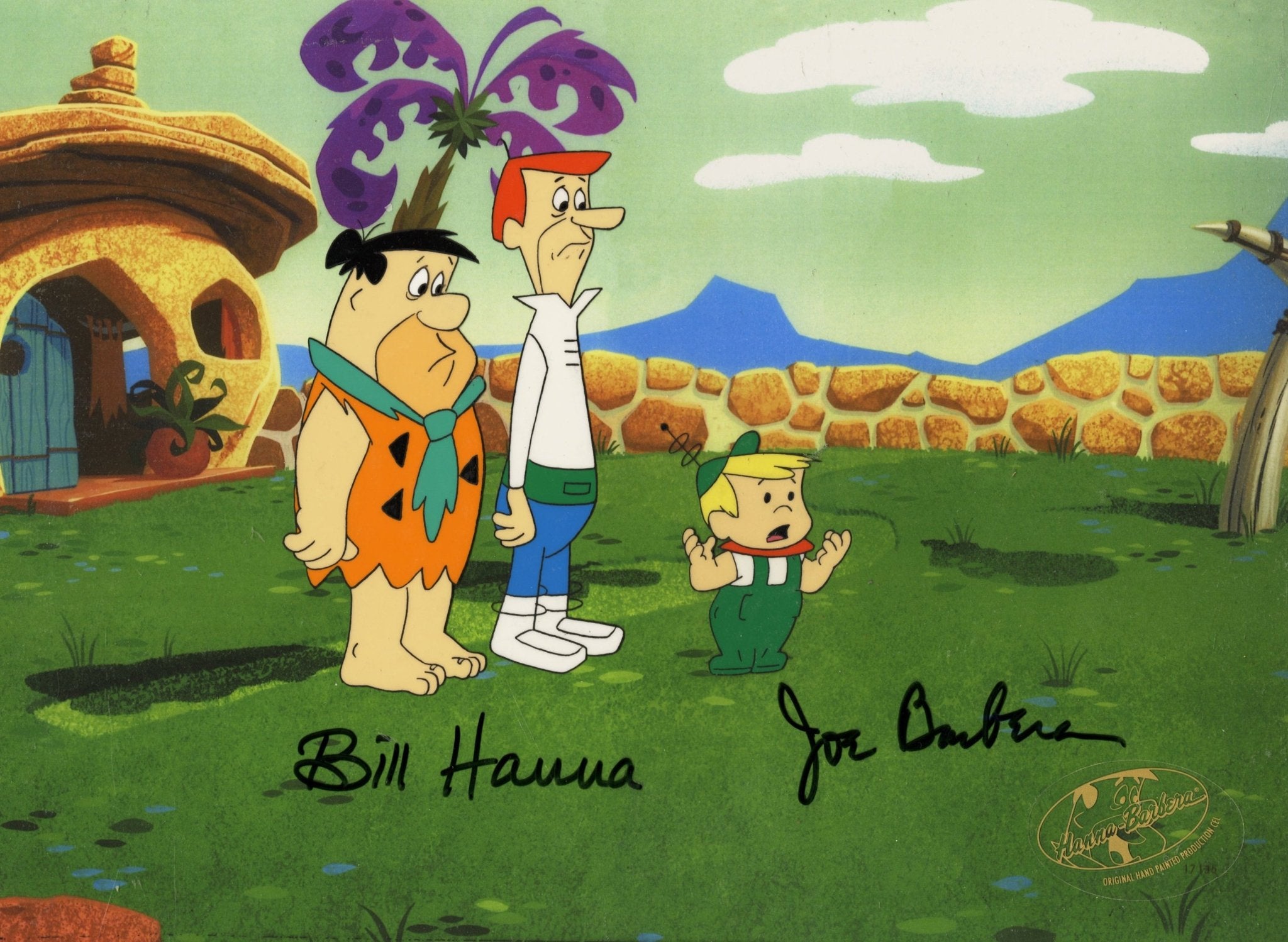 The Jetsons Meet The Flintstones Original Production Cel Signed by Bill Hanna and Joe Barbera: Fred, George, Elroy