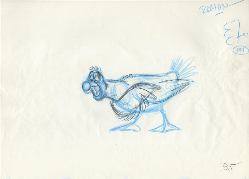 Rick Farmiloe supervised the animation of Scuttle throughout the film, and these are his drawings. The animator wrote Scuttle's word of dialogue on at upper right: "vocal", "roman—" and "antic." The animator wrote the designations "165", "185" and "189" at lower right to indicate each original's place in the scene. Our certificate of authenticity is included.