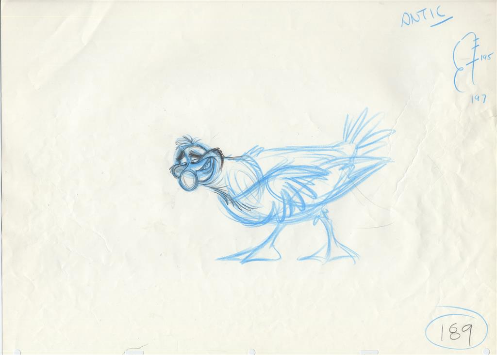 Rick Farmiloe supervised the animation of Scuttle throughout the film, and these are his drawings. The animator wrote Scuttle's word of dialogue on at upper right: "vocal", "roman—" and "antic." The animator wrote the designations "165", "185" and "189" at lower right to indicate each original's place in the scene. Our certificate of authenticity is included.