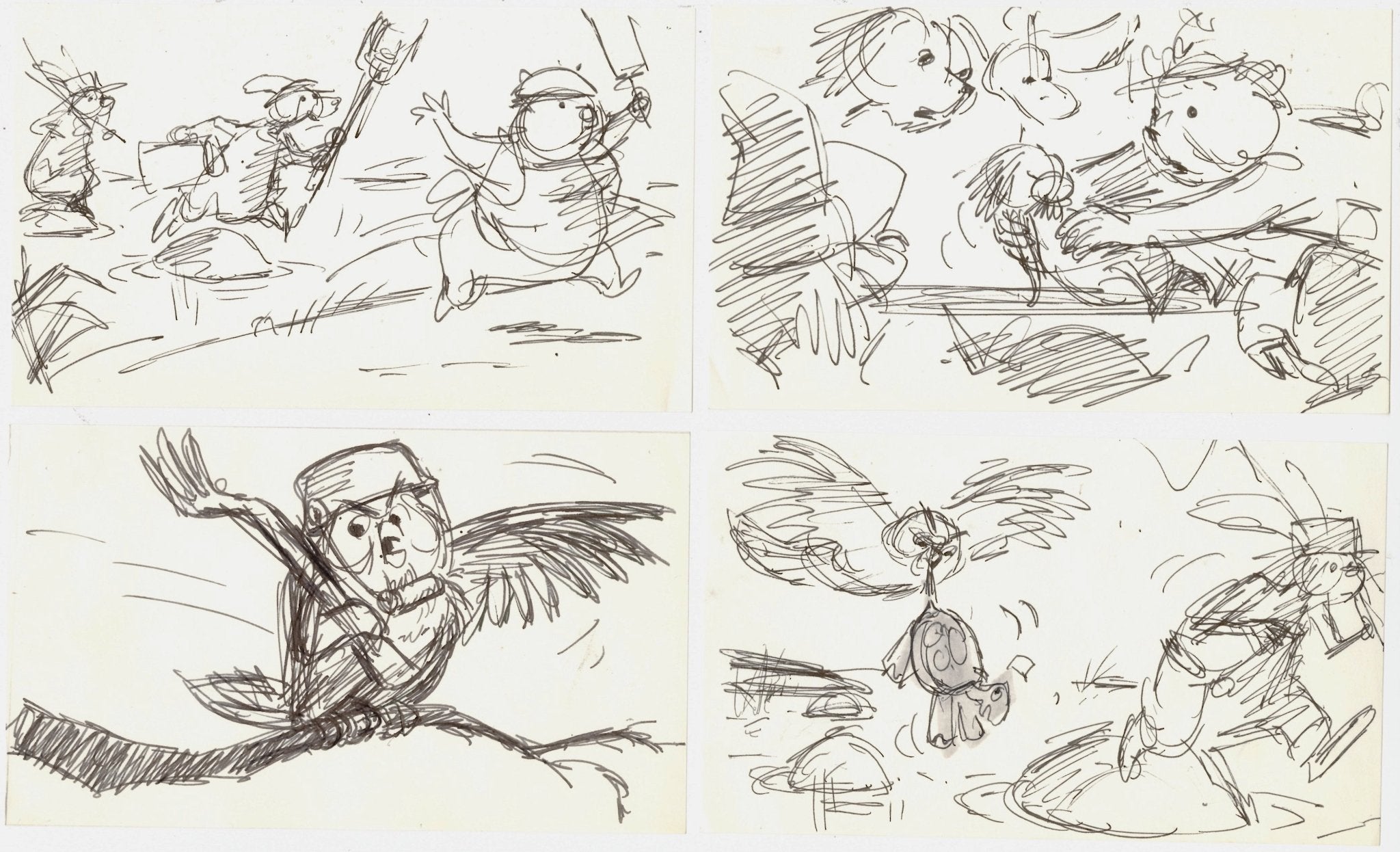 The Rescuers Storyboard Drawings (Set of 4): Deadeye, Luke, Ellie Mae, Deacon Owl, Gramps