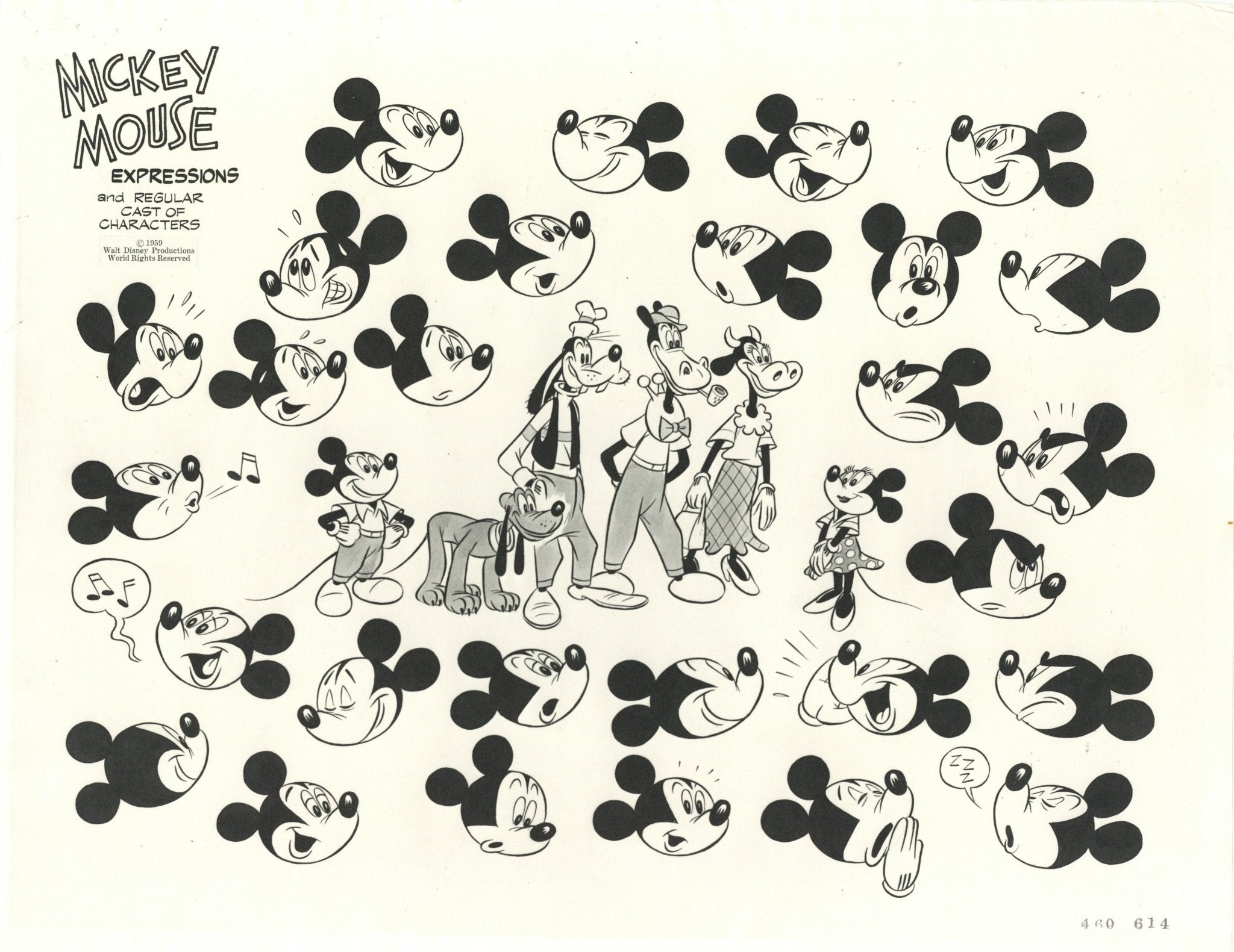 ABOUT THE MEDIUM: Photostat Model Sheets are reference guides used by animators to ensure consistency in character design, proportions, and expressions throughout a film. These printed sheets typically feature multiple poses, facial expressions, and turnarounds of a character, often photocopied from finalized drawings by lead animators. Model sheets help maintain uniformity in animation by providing a standard reference for all artists working on a character, preventing visual discrepancies between different scenes.